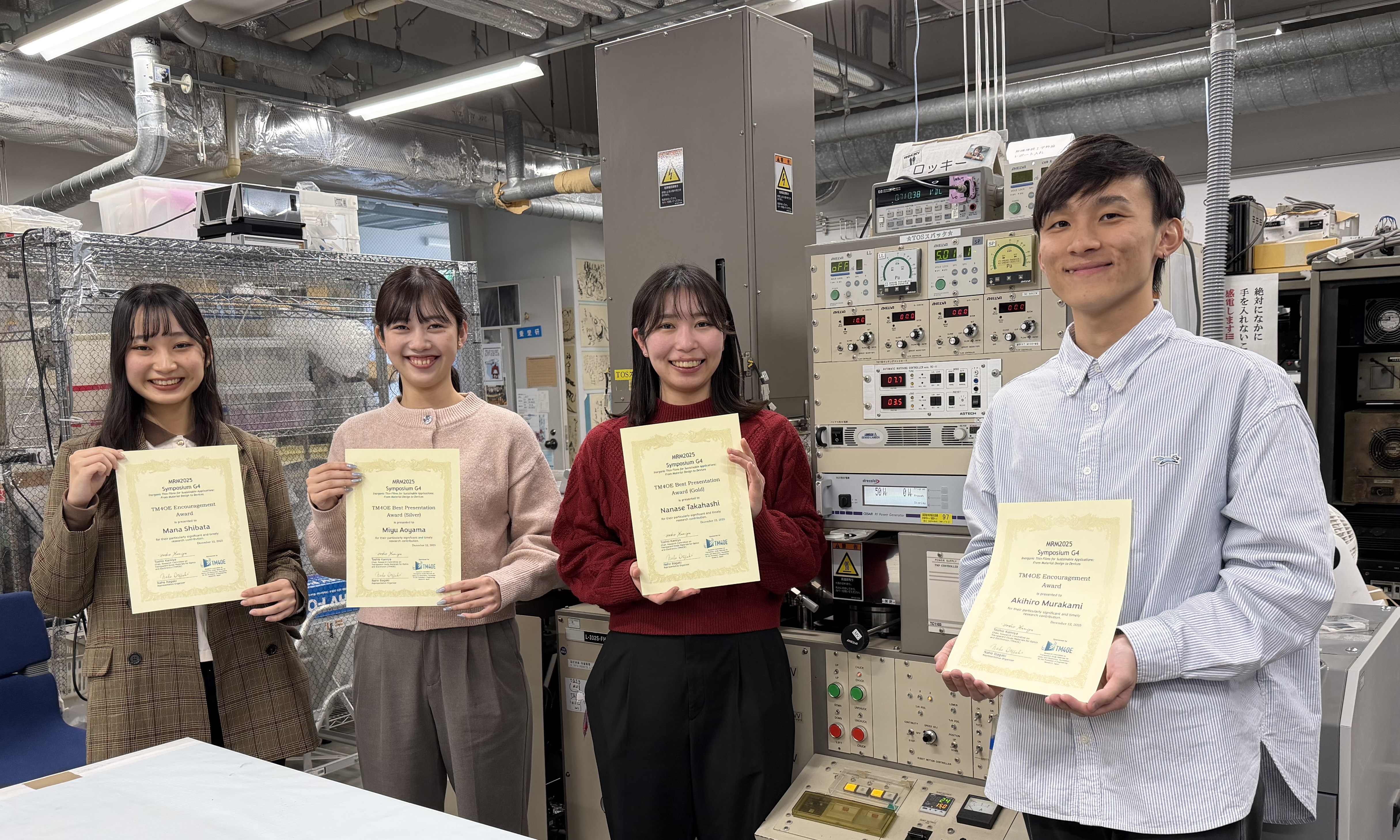 2025年12月8~13日に、パシフィコ横浜で開催されたMaterials Research Meeting (MRM2025)国際会議のシンポジウム:Symposium G-4; Inorganic Thin Films for Sustainable Applications: From Material Design to Devices (持続可能な社会を実現するための無機薄膜:材料設計からデバイスへ)にて、理工学研究科機能物質創成コース博士前期課程2年・重里有三研究室の高橋七瀬さんがTM4OE Best Presentation AwardのGoldを、同研究室の博士前期課程1年の青山実夢さんが同賞のSilverを、柴田茉奈さん、村上彰啓さんがTM4OE Encouragement Awardを受賞しました。