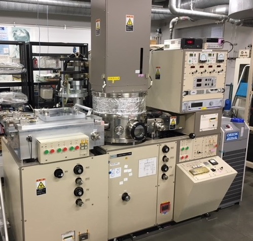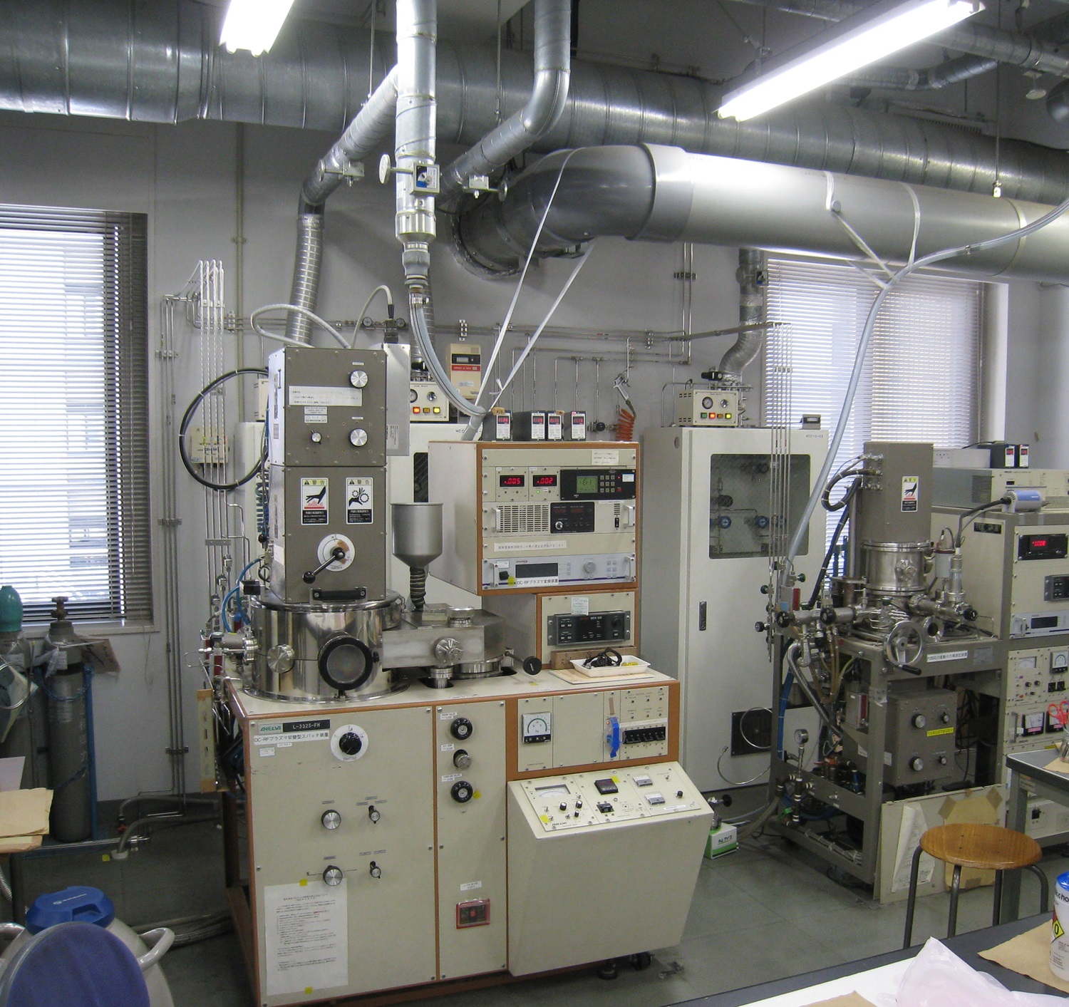 ある種の希土類元素、あるいは遷移金属とMgの合金において、最上面に 5-10 nm の極薄パラジウム膜を触媒として担持することで水素化/脱水素化反応により金属/半導体と相変化する物質が存在します。これらは調光ミラー材料と呼ばれています。可逆的な水素化/脱水素化反応は、(1)1気圧の3%水素含有窒素ガス(爆発限界以下の安全な水素濃度)中に曝露するガスクロミック方式、並びに(2)電解液中で電気化学的な H⁺注入により水素化/脱水素化反応を行うエレクトロクロミック方式があります。重里研究室は多くの材料に関してスパッタ法で成膜を繰り返し、これら(1),(2)の両方の方式での可逆的水素化反応に最適な材料、並びに薄膜合成条件を探求してきました。これらの知見を基にして、透明導電膜(ITO)/調光ミラー薄膜(Y-Mg)/触媒層(Pd)/リーク電流バリア膜(thin-WO₃)/イオン導電膜 (Ta₂O₅)/イオン貯蔵膜(HxWO₃)/透明導電膜(ITO)の 7 層からなる全固体薄膜積層型熱スイッチの作製に成功しました。それぞれ異なる物性を有する機能性無機薄膜は、研究室内の異なるスパッタ装置を用いて製膜されました。