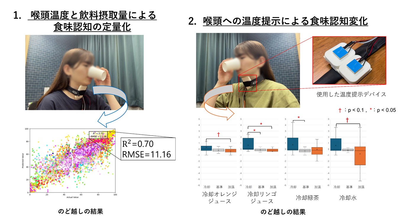 研究グループは、喉(喉頭)を対象にのど越しなどの感覚である「飲み心地」を「測る」と「変える」の2つのアプローチを統合した新しい手法を開発しました。本手法は大きく2つの実験を経て検証しました。