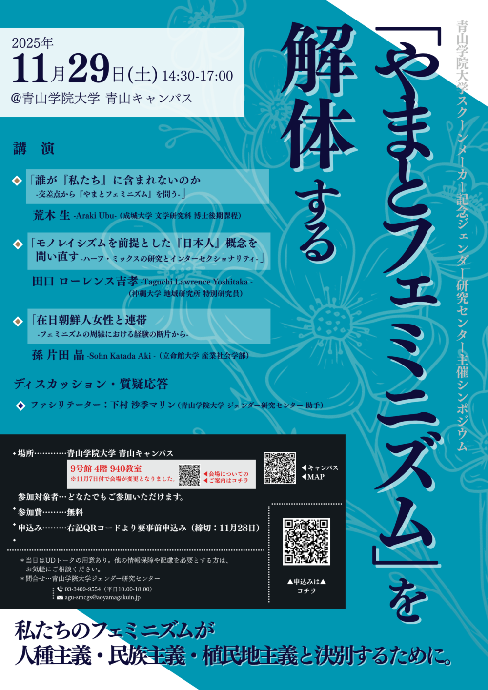 【ジェンダー研究センター】シンポジウム『「やまとフェミニズム」を解体する -私たちのフェミニズムが人種主義・民族主義・植民地主義と決別するために。-』