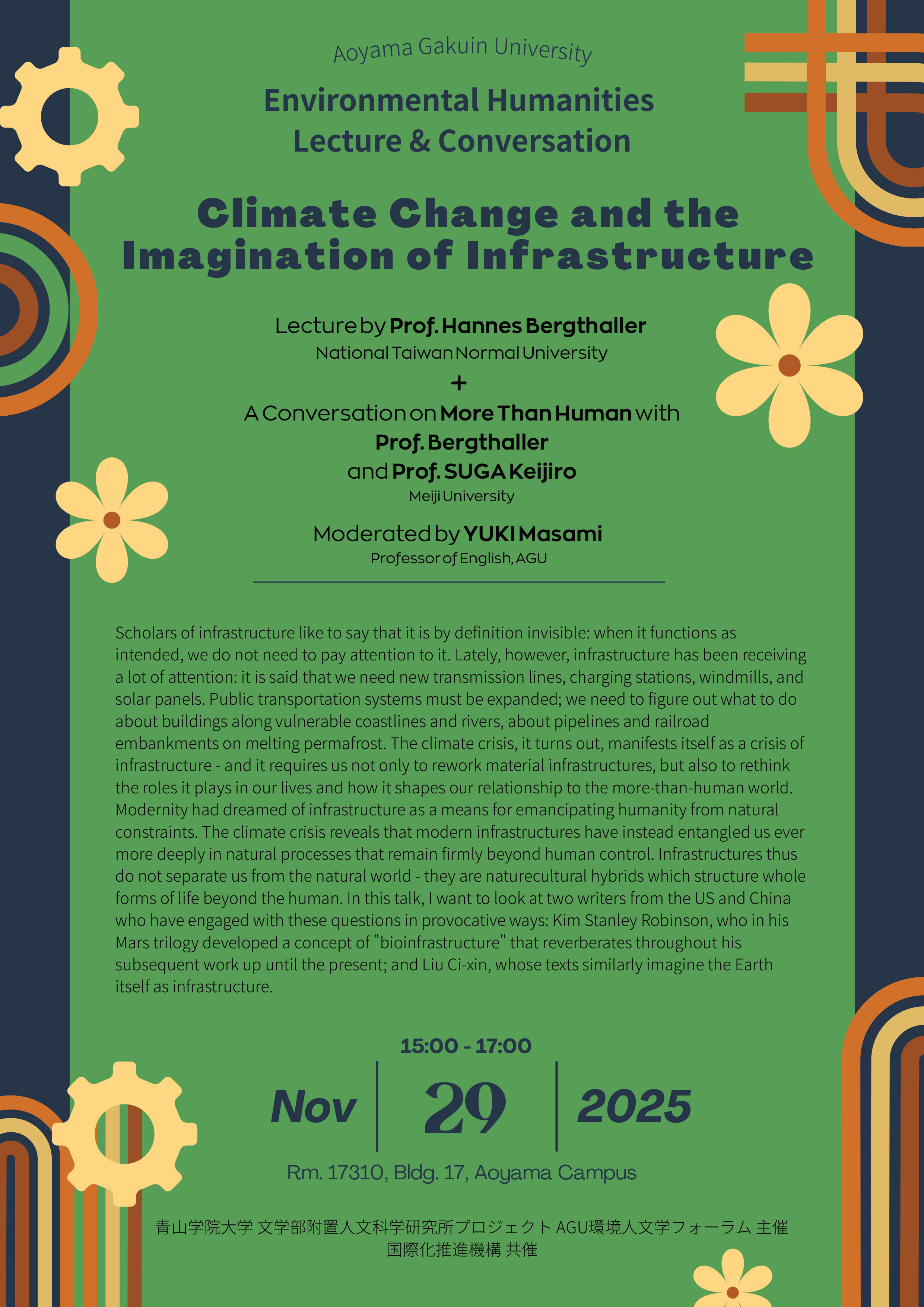気候変動の加速には、電力システムや流通・交通・流通網などが相互に絡まるインフラストラクチャーの問題が関わっています。そうした現状を見据え、インフラストラクチャーをめぐる想像力をテーマに、エコクリティシズム(環境文学研究)の第一人者である Hannes Bergthaller教授(国立台湾師範大学)の講演を行います。その後、本学大学院 文学研究科英米文学専攻の「環境人文学プログラム」で連携している管啓次郎教授(明治大学 理工学部)およびHannes Bergthaller教授とともに、人間とノンヒューマンが絡まりあうモア・ザン・ヒューマンをめぐって話し合います。