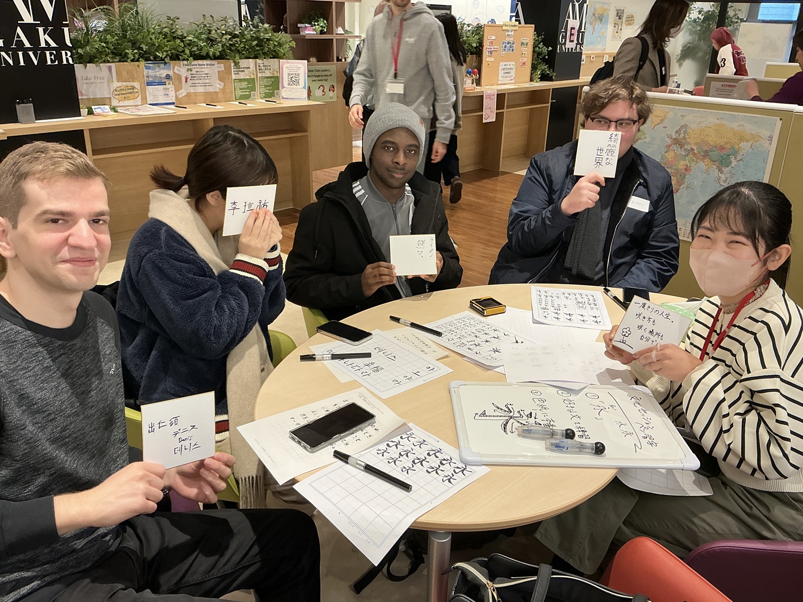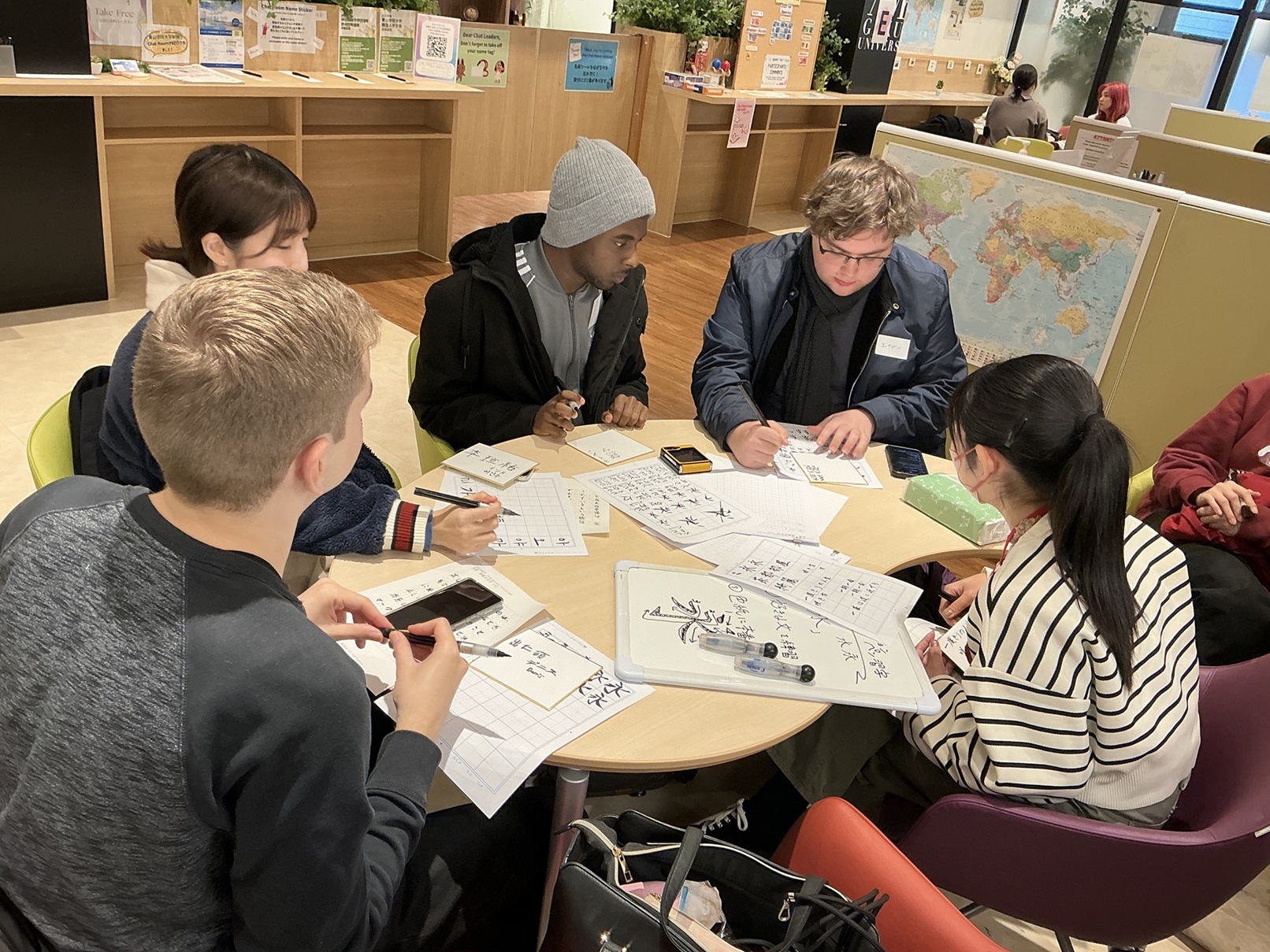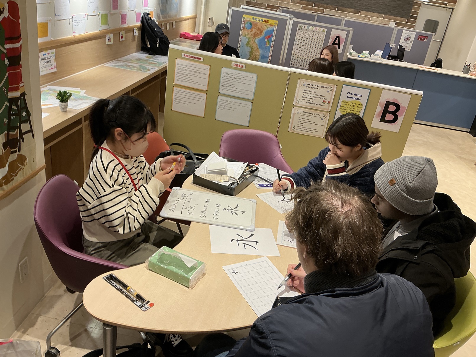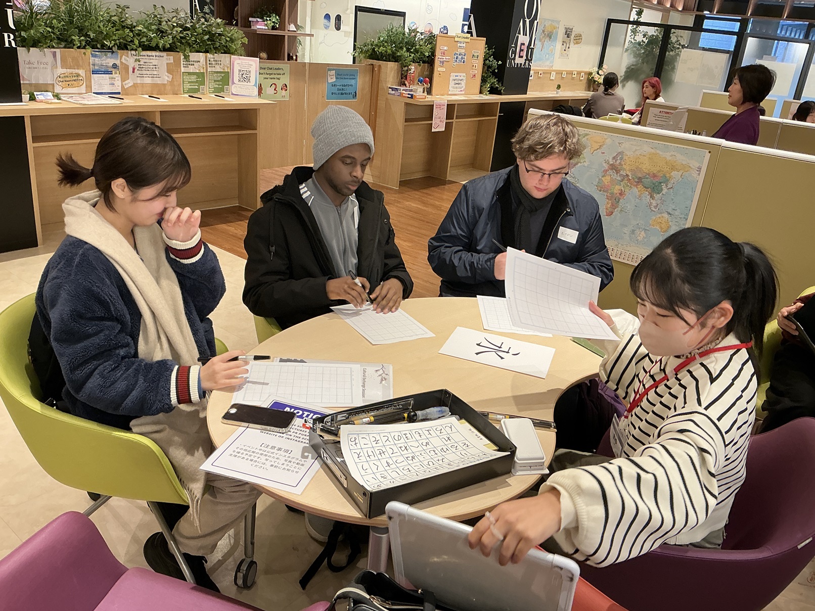 参加者たちは、漢字の筆順や読み方を確認しながら、自分の名前を練習したり、聖書の言葉を書いたりしました。全員、筆ペンを初めて使ったにもかかわらずとても上手に次々と書いて日本語チャットリーダーを驚かせていました。