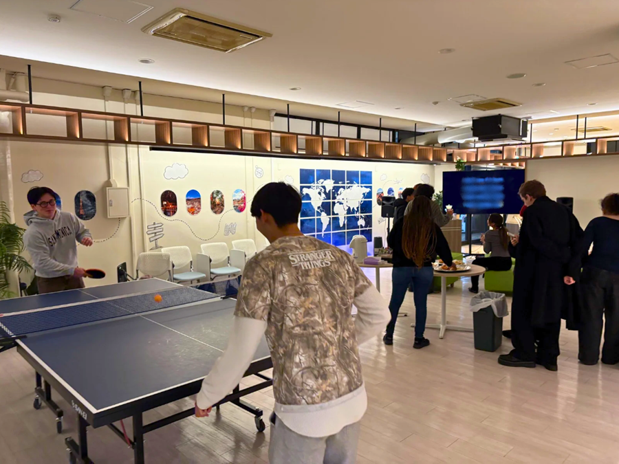 今学期で本学での勉学を終えて卒業する学生や留学を終える学生たちを送り出すため、お別れ会を開催しました。会場には卓球やボードゲーム、カラオケが設置され、参加者はそれぞれで盛り上がりを見せていました。カラオケでは英語や日本語だけでなく、留学生の母国語や一般学生が学習中の外国語の歌などが次々と披露され、まさに多言語が飛び交う空間となりました。 イベントでは、後期の思い出を振り返るショートムービーを鑑賞しました。これまでのイベントの様子を振り返る時間となり、良い締めくくりの時となりました。 この日は、留学生と一般学生合わせて約40名が集まり、別れを惜しみつつも賑やかなひとときを過ごしました。