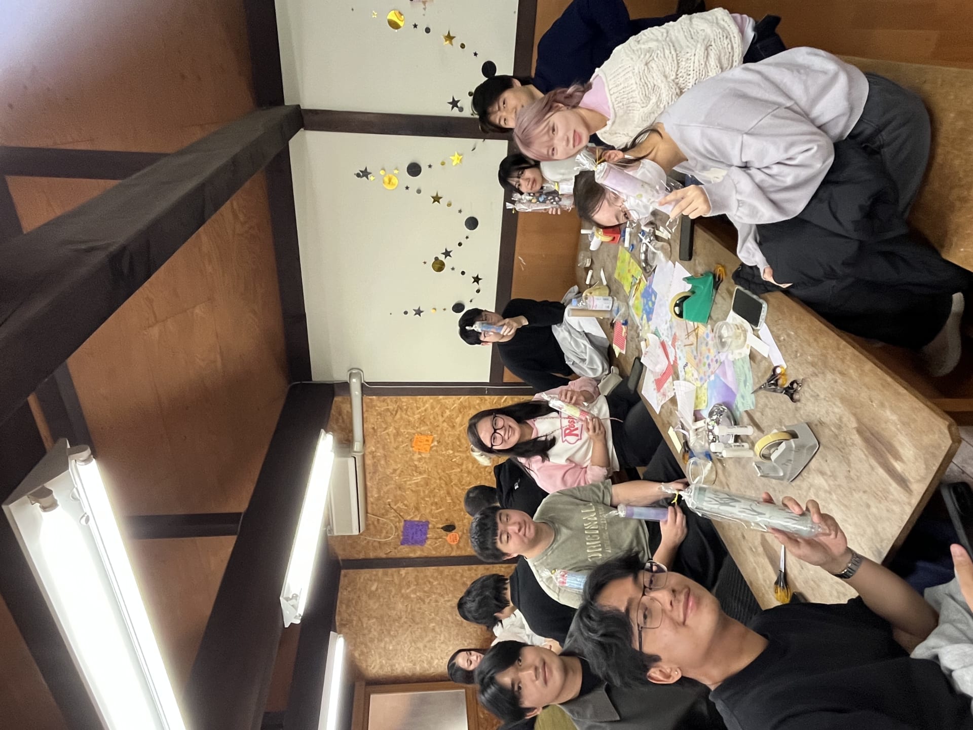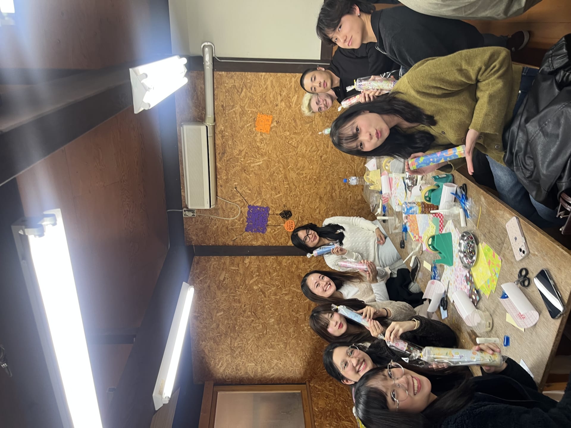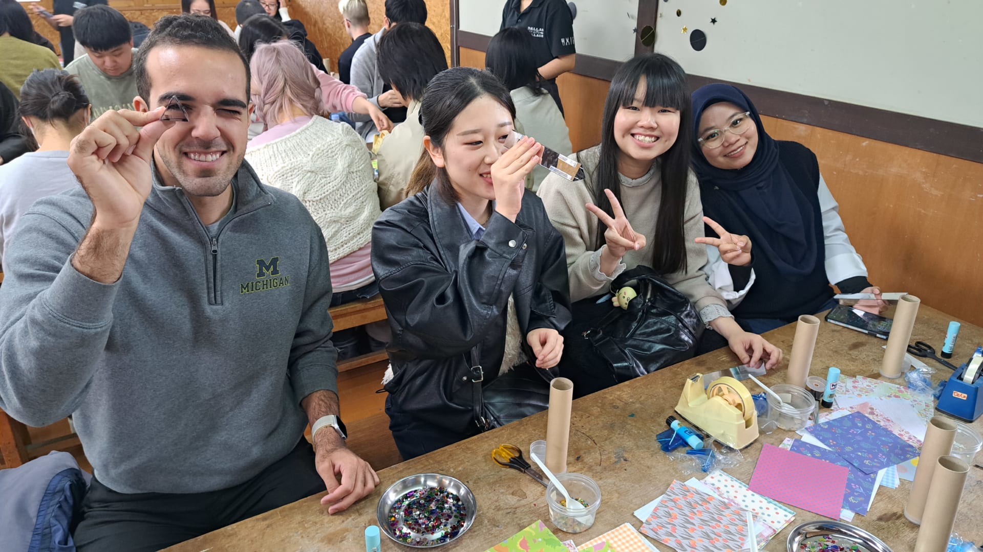 最初の行先は体験工房。日本伝統玩具の万華鏡作りに挑戦です。 一見、簡単に作れそうですが、手先の器用さと集中力が必要。 先生の説明を聞きながら、学生たちは真剣な表情で工作。 万華鏡を回しながら覗くと美しい煌めきが見えて、驚きと笑顔の表情が印象的でした。 思い出の品として大切にしてほしいものです。