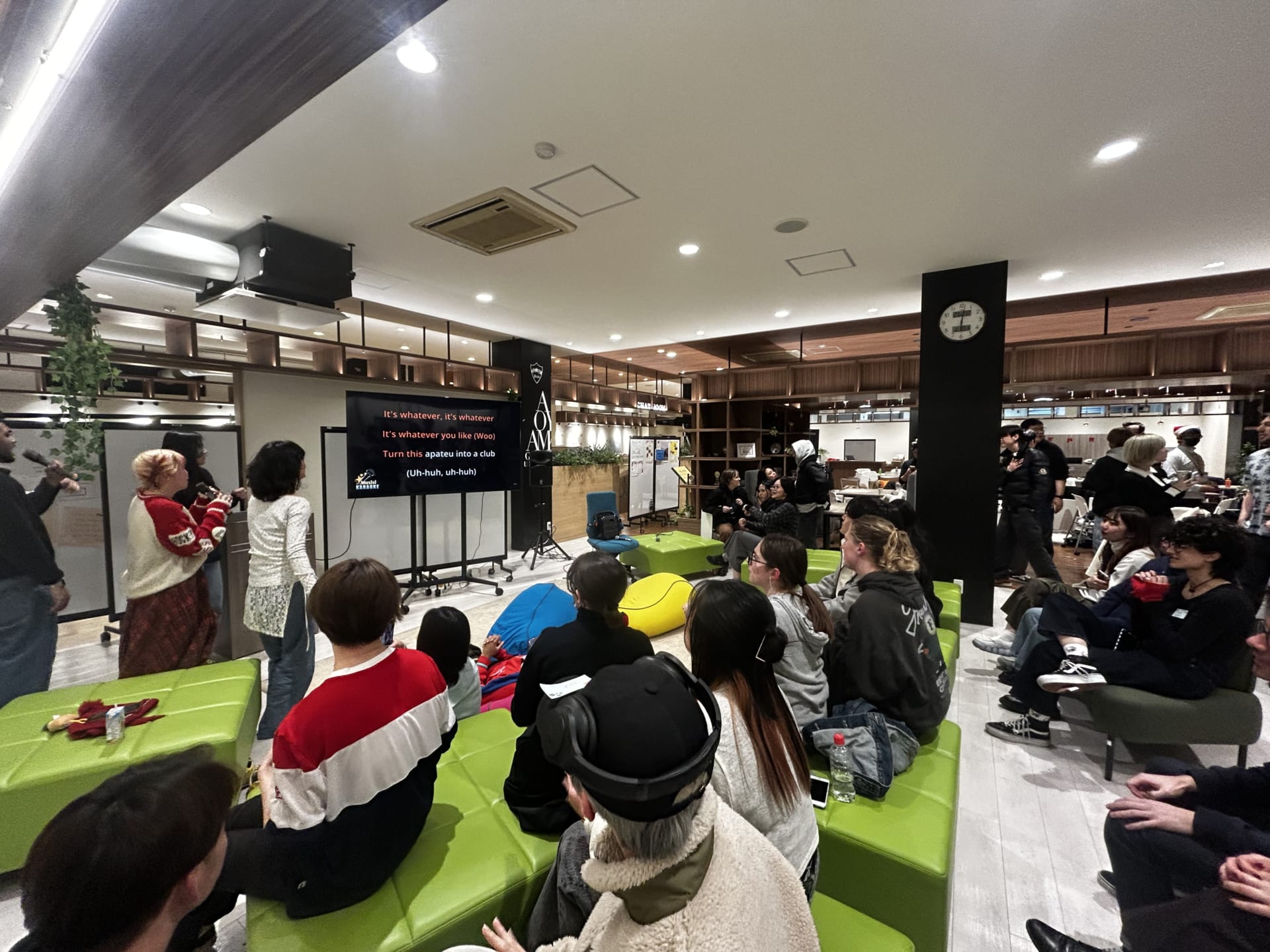 In this Meet Up Cafe, we held a “Karaoke Night”. After they introduced themselves to each other in each group, they enjoyed drinks and snacks while singing karaoke. Students requested a song they wanted to sing, including classic Christmas songs, current popular songs that everyone knows.