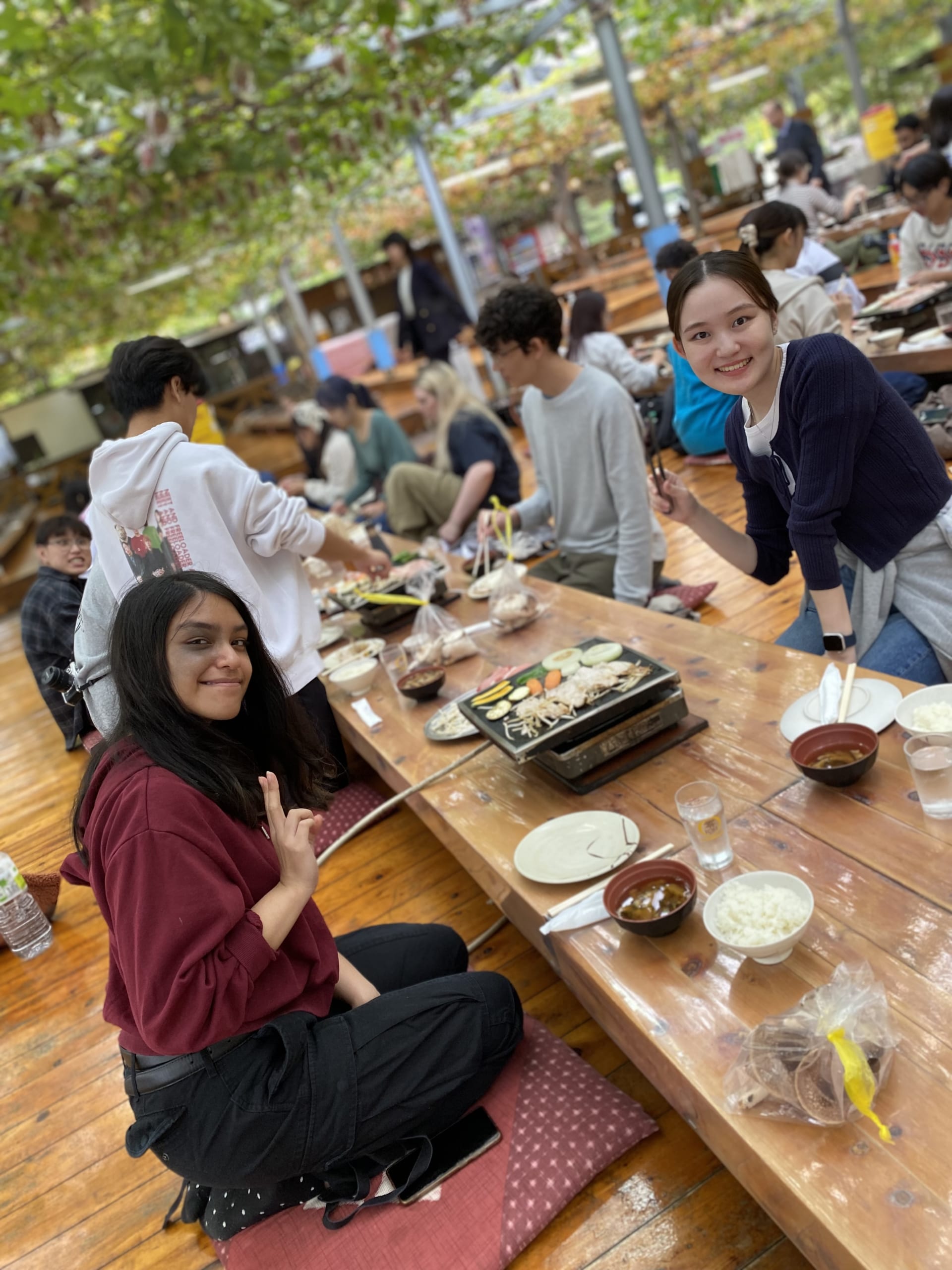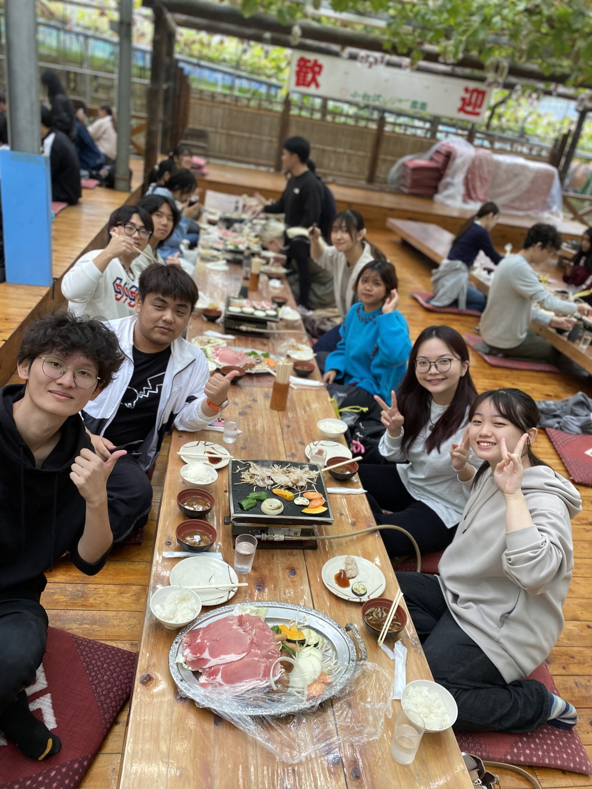 With freshly picked mushrooms in hand, they headed for the BBQ. Under the ceiling full of grapes, they enjoyed a BBQ while grilling meat, vegetables and mushrooms they had picked. Students who had never met each other before quickly became friends after eating lunch together at the same table. They had a great time with having a delicious meal and communicating each other in both English and Japanese.