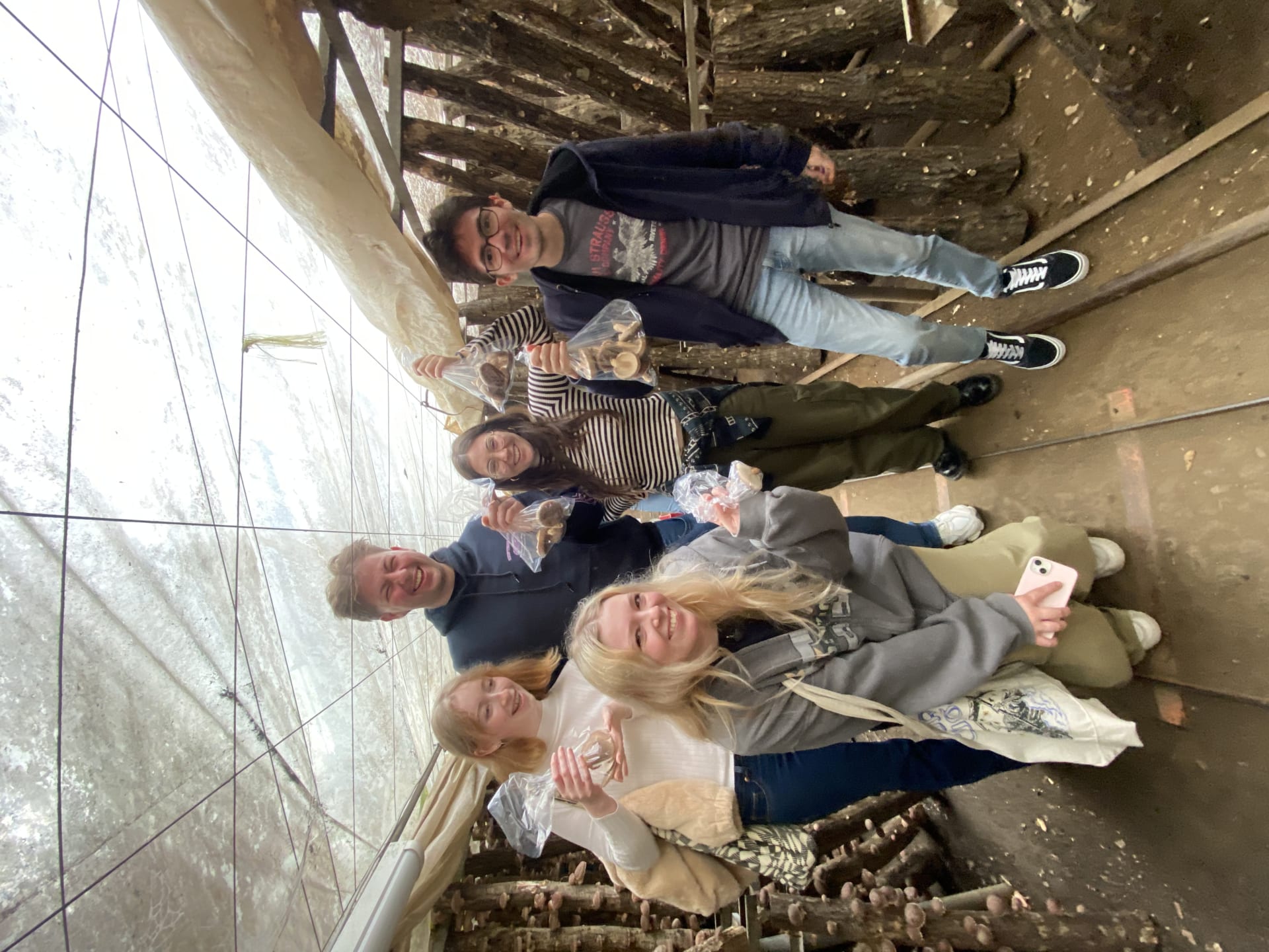 After arriving at Nagatoro Leisure Farm, the students experienced mushroom picking. Before they entered a greenhouse with mushrooms, they were instructed how to differentiate delicious shiitake mushrooms. Many of the international students were curious about Japanese shiitake mushrooms, and enjoyed picking shiitake mushrooms, examining their shape and size with the help of the Japanese students.