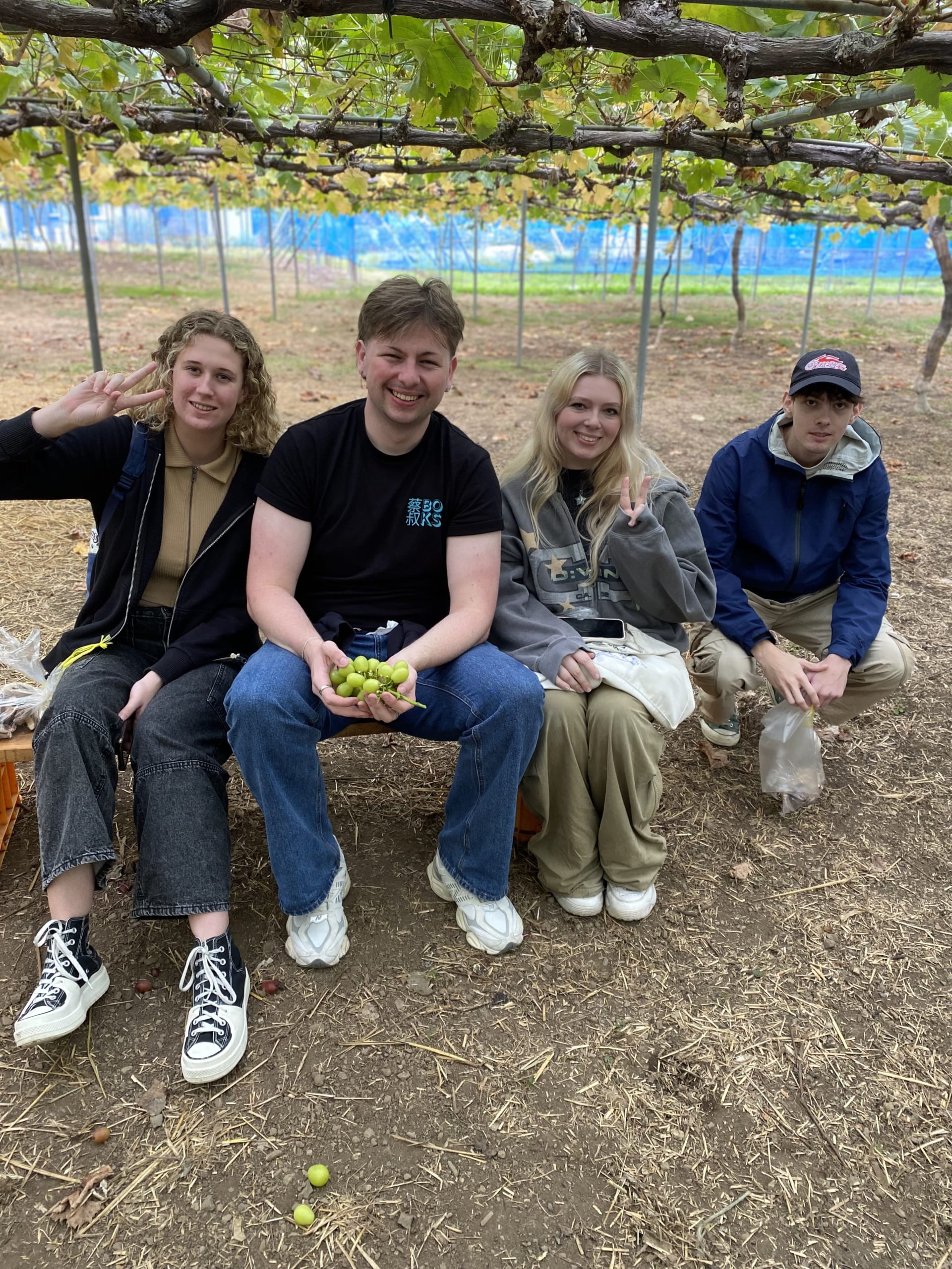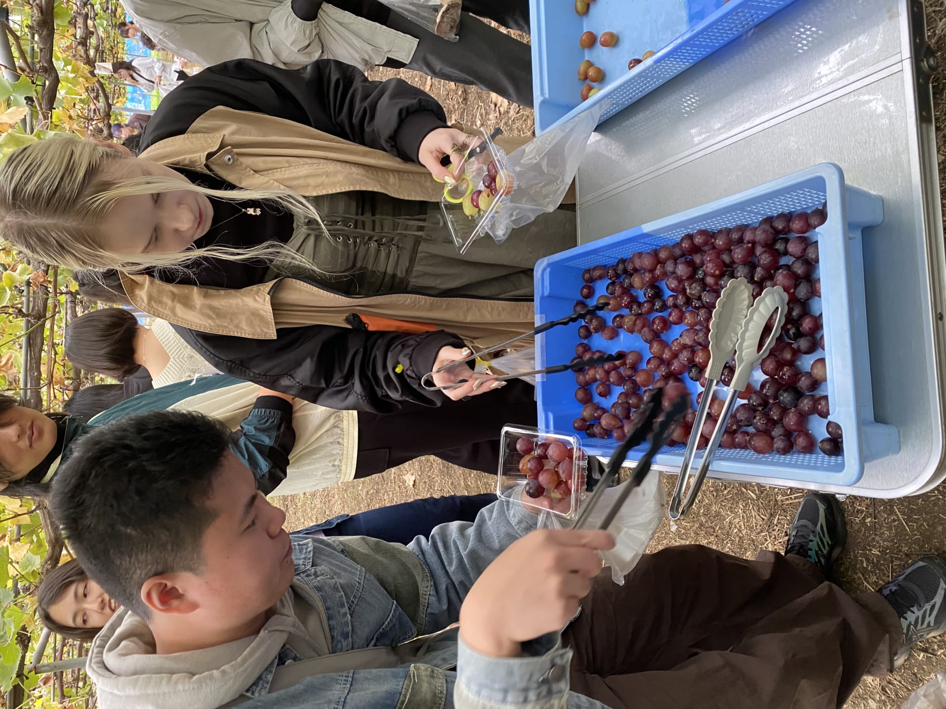 After they had lunch, it was time for dessert! They picked the seasonal fruit, “Shine Muscat”. They were divided into groups and looked for bunches with large grains. Some teams shared them among several people, while others tried to finish the whole bunch by oneself. Each team tasted the fresh fruit and deepened their exchange with each other.