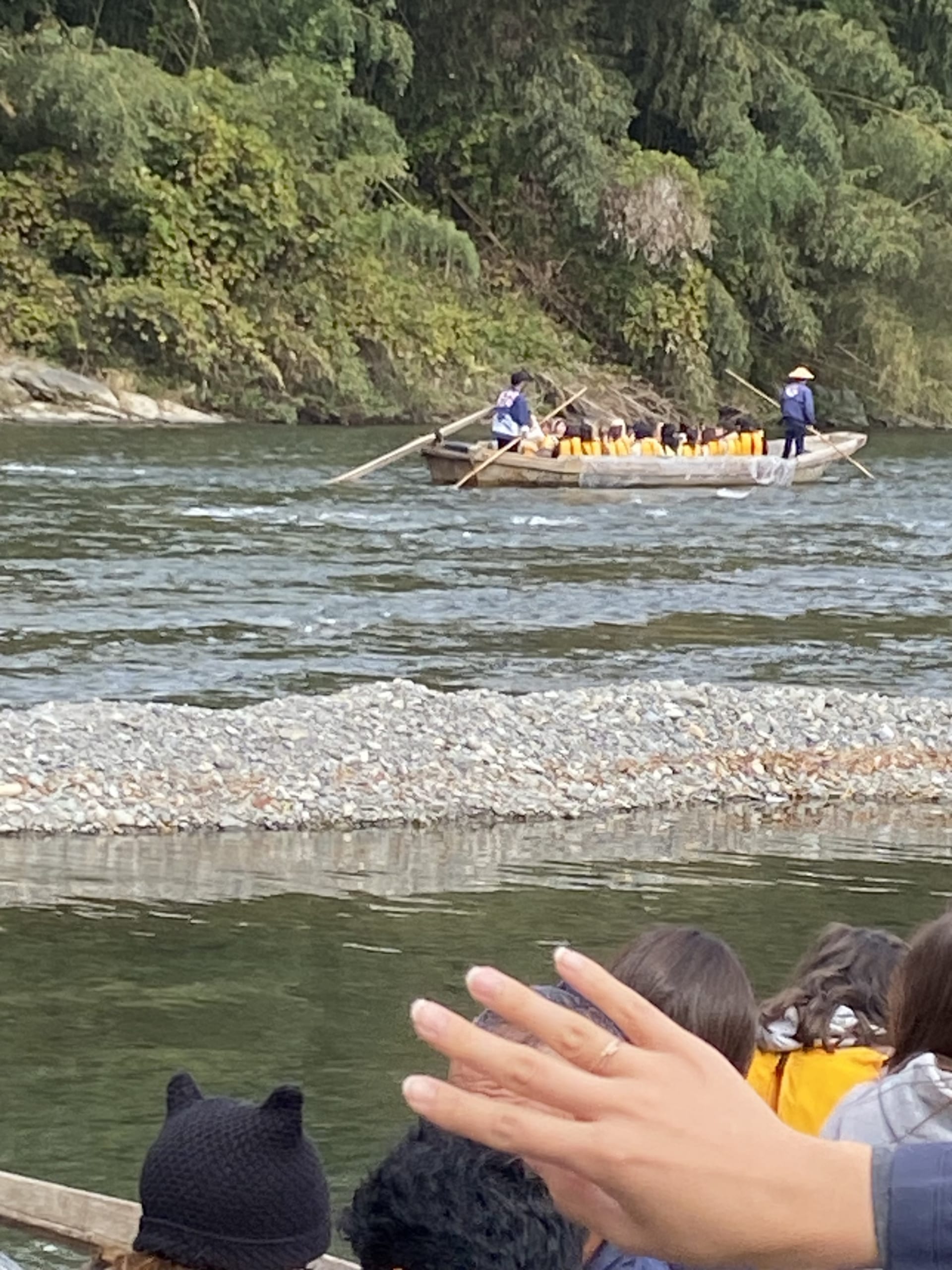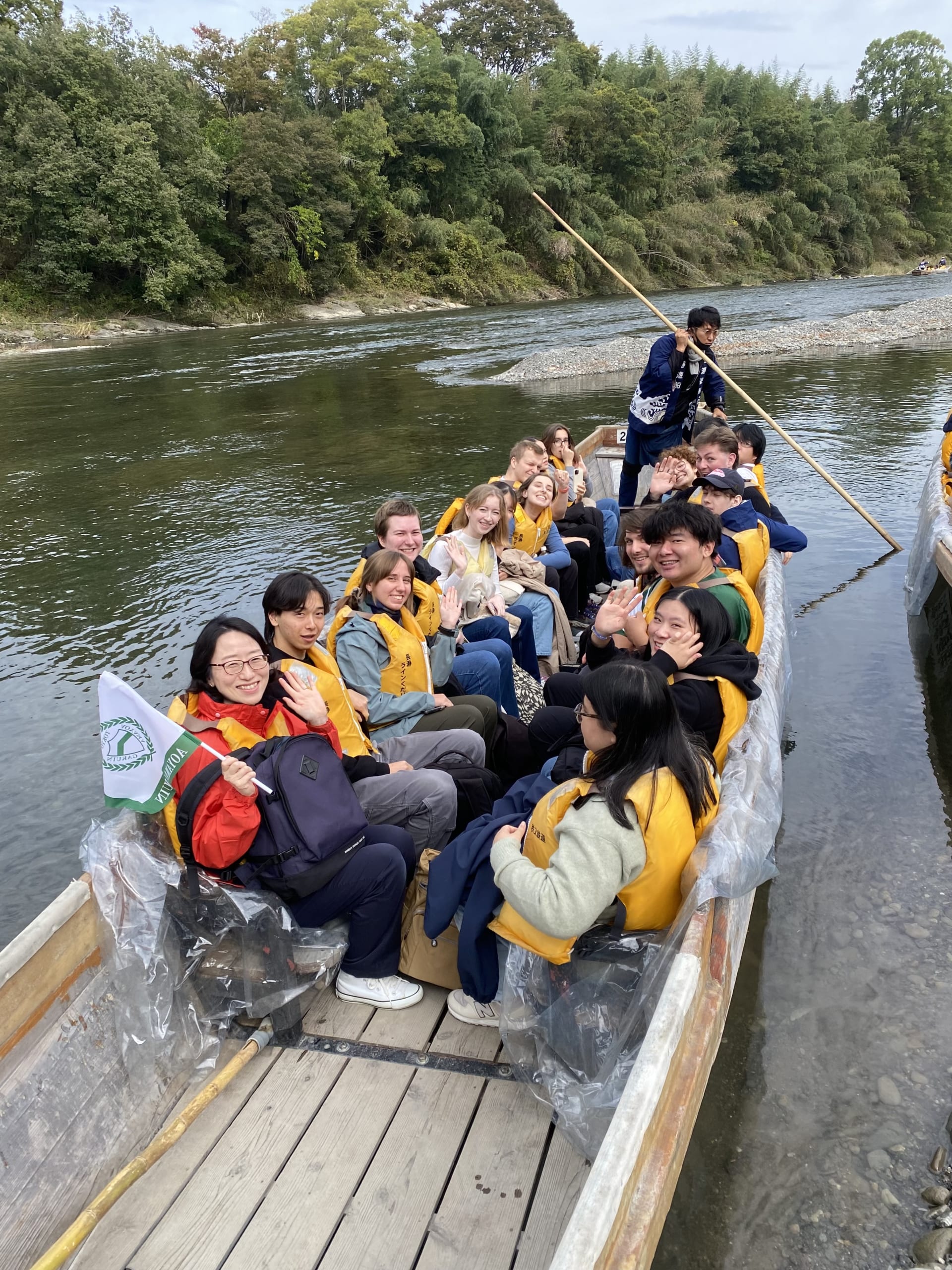First, they tried a river cruise. The water level was low, as the boats sometimes skidded on the bottom of the river, but the splashes of the fast-flowing river made for a powerful ride. The boatman told the students about Nagatoro Valley and photo spots in the mountains, and the students enjoyed the beauty of nature as they took pictures of the surroundings.