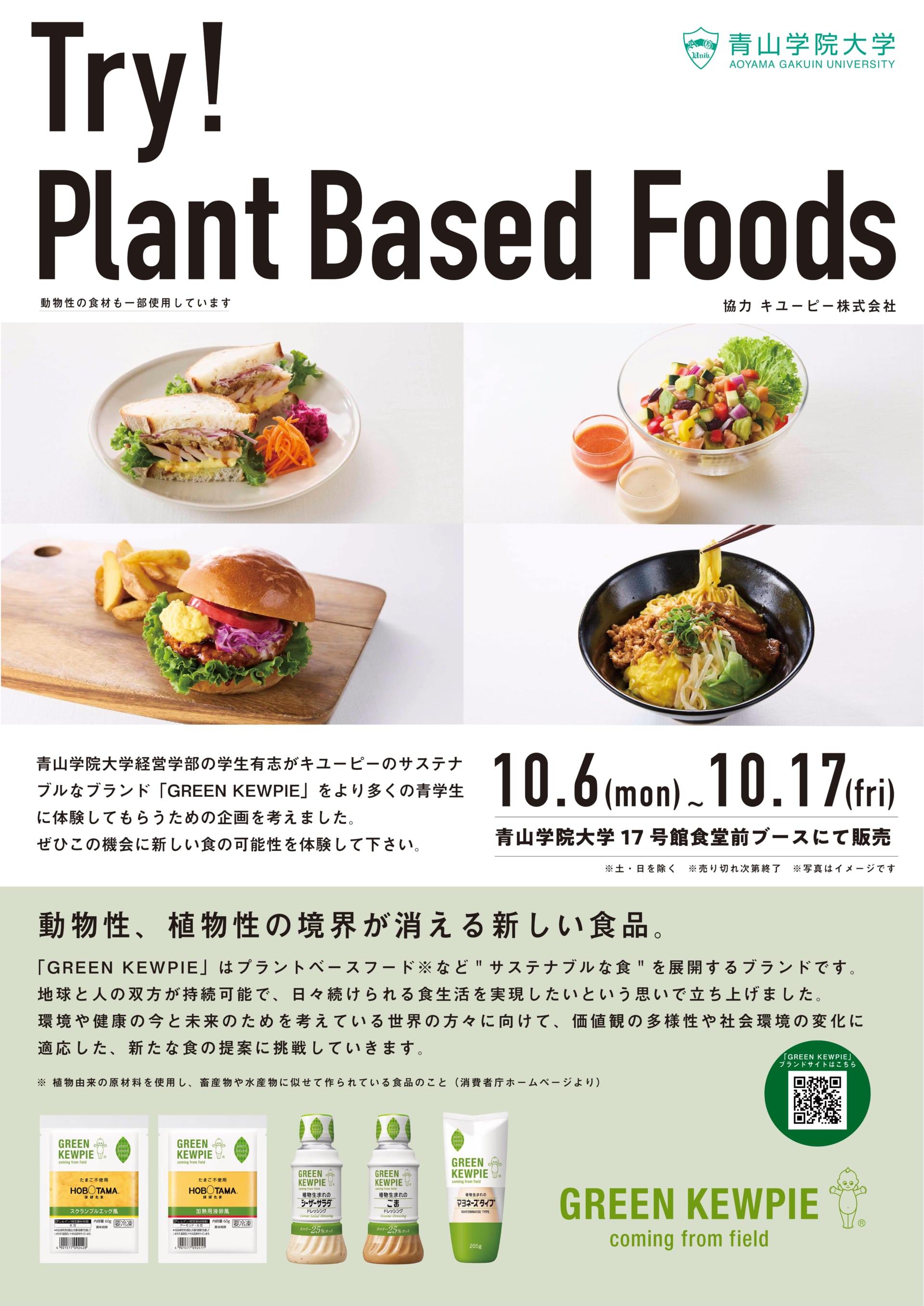 キユーピー株式会社と青山学院大学経営学部の学生が、将来を担う若い世代に「GREEN KEWPIE」を広めるための共同プロジェクトを、2024年12月に始動しました。産学連携プロジェクトの集大成として、GREEN KEWPIEのドレッシングなどを使った限定メニューを販売するイベント「Try! Plant Based Foods」を、2025年10月6日(月)から2週間、青山キャンパスで学生向けに開催します。