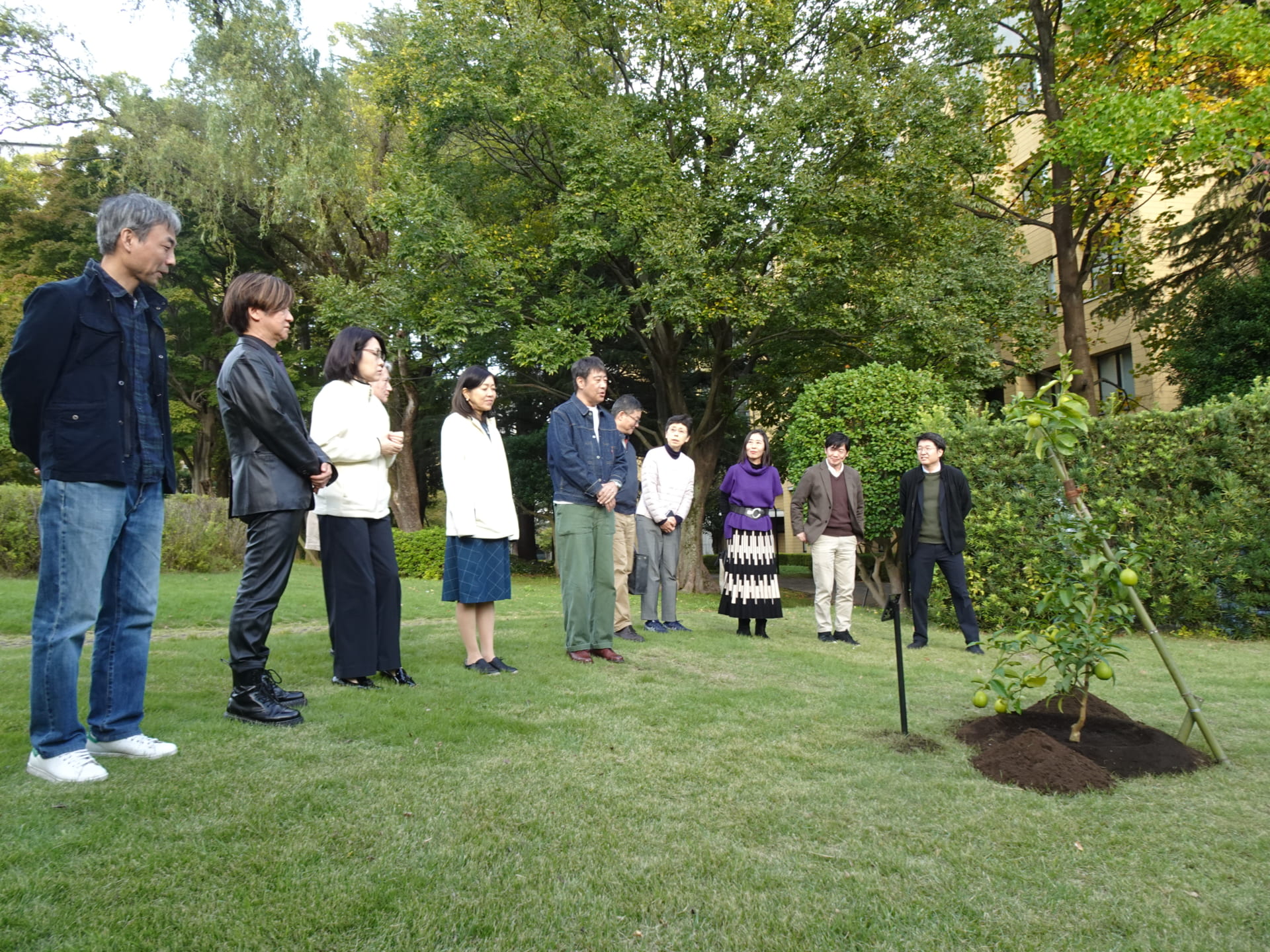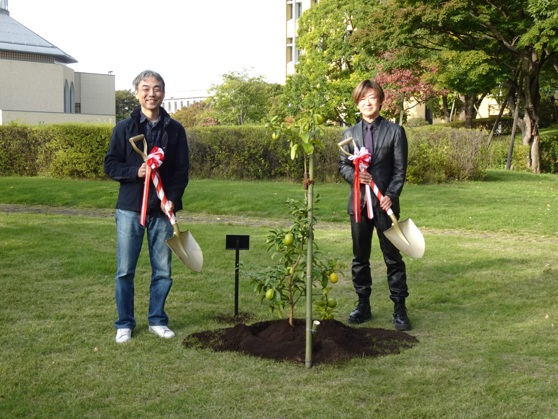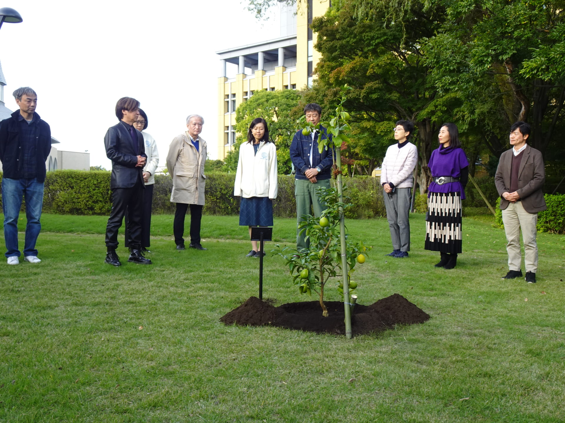 2025年10月29日(水)に、地球社会共生学部学の創立10周年記念植樹を実施しました。林教授による簡単な挨拶の後、エリック学部長と樺島教授が記念のレモンの木を植えました。植樹後、参加者にレモンが配られました。
