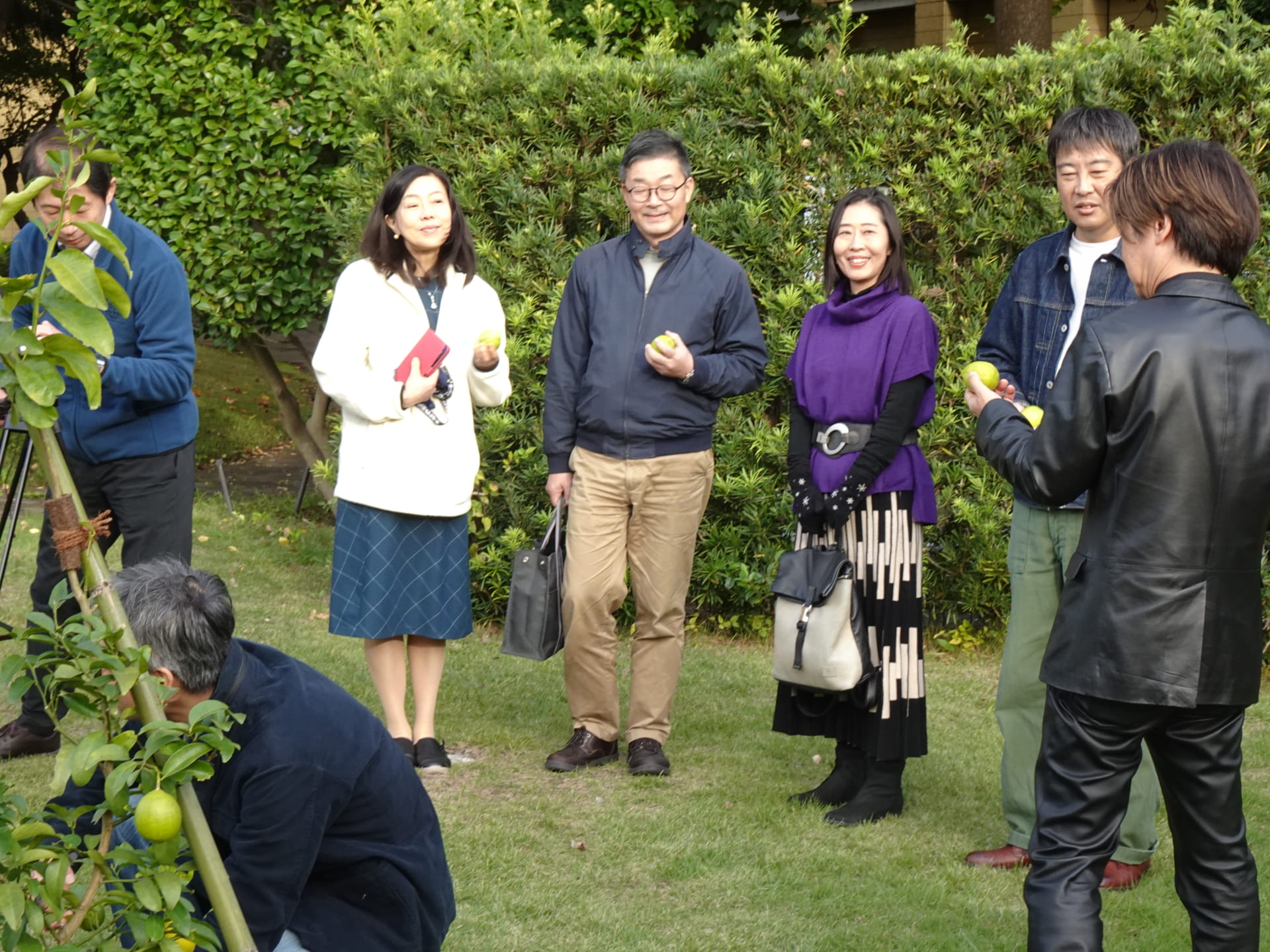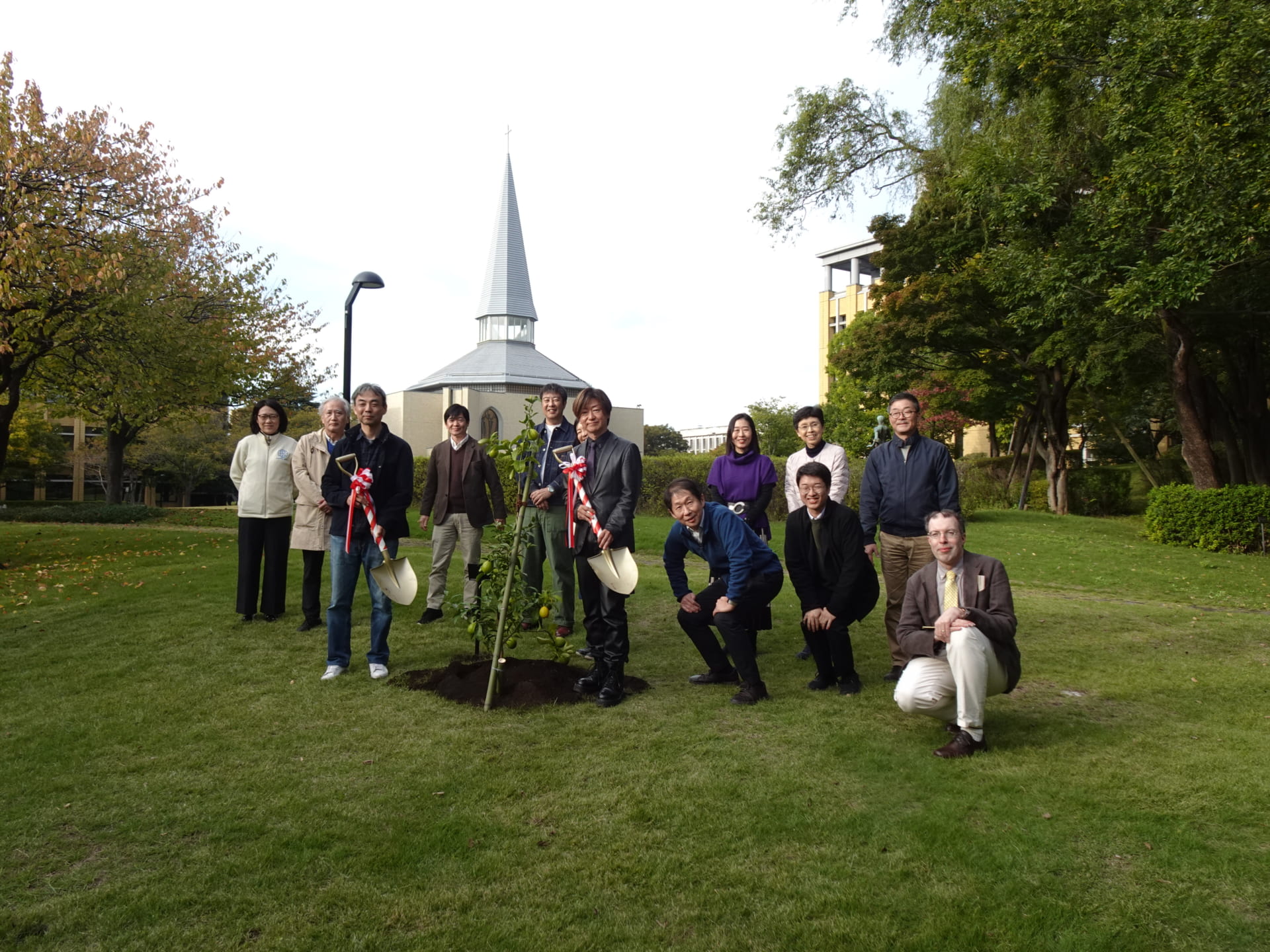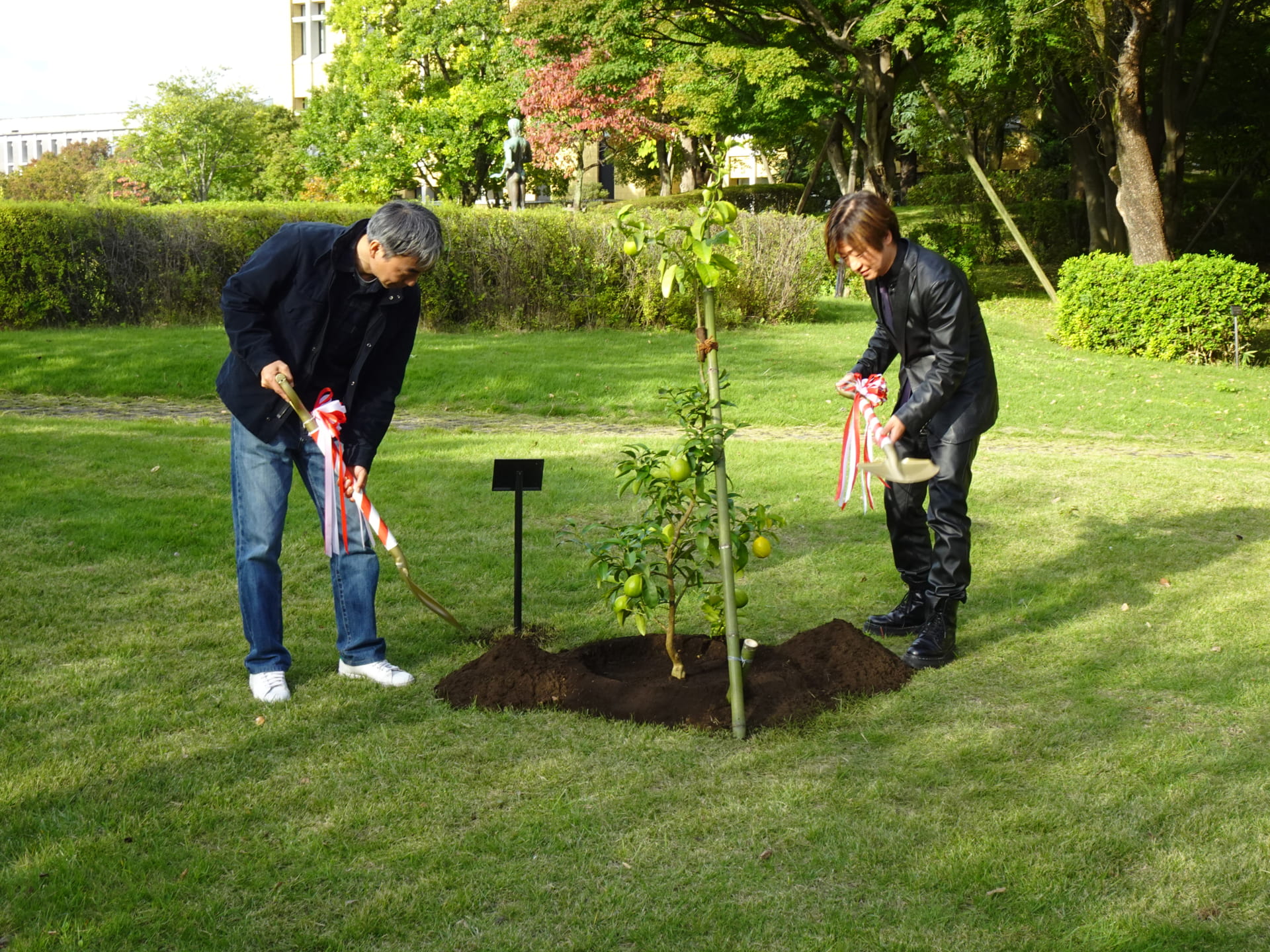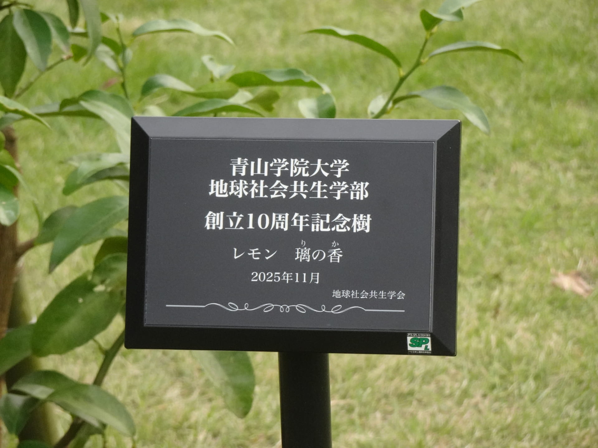 2025年10月29日(水)に、地球社会共生学部学の創立10周年記念植樹を実施しました。林教授による簡単な挨拶の後、エリック学部長と樺島教授が記念のレモンの木を植えました。植樹後、参加者にレモンが配られました。