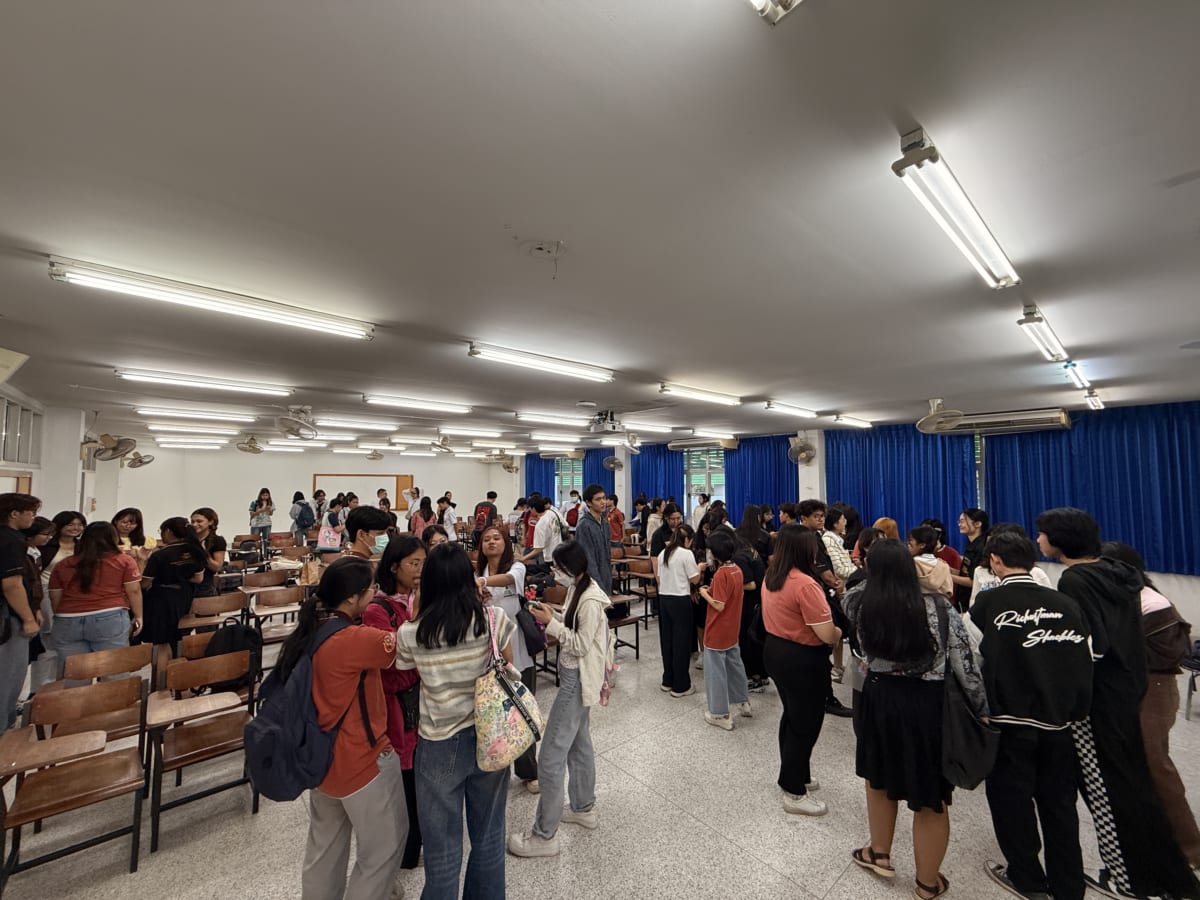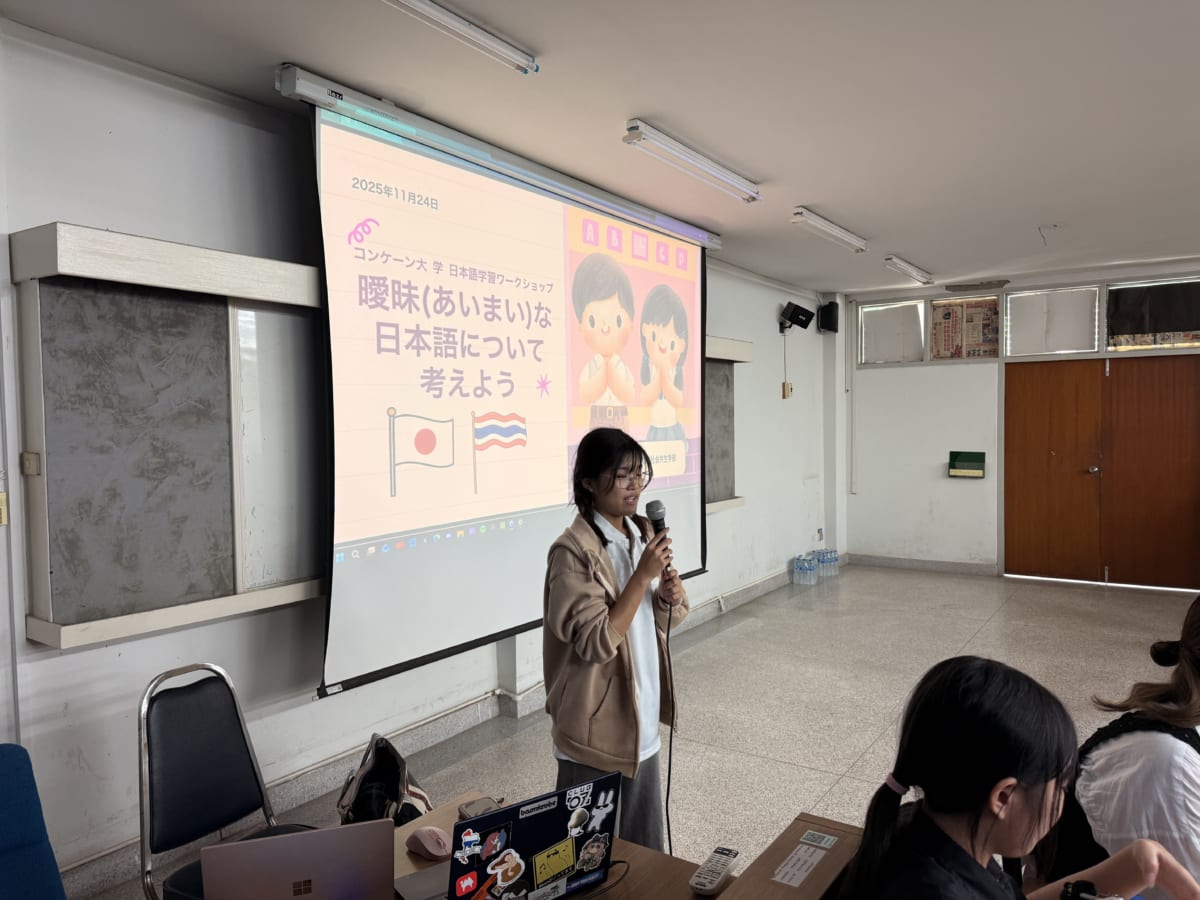 2025年11月24日(月)、現在タイに留学中の地球社会共生学部の学生有志が、同学部の林拓也教授の引率のもと、タイ東北部に位置する国立コンケーン大学人文社会学部で日本語を学ぶ学生を対象に、日本語ワークショップを実施しました。今回は約60人のタイ人日本語学習者が参加し、日タイ双方の学生が共に学ぶ貴重な機会となりました。