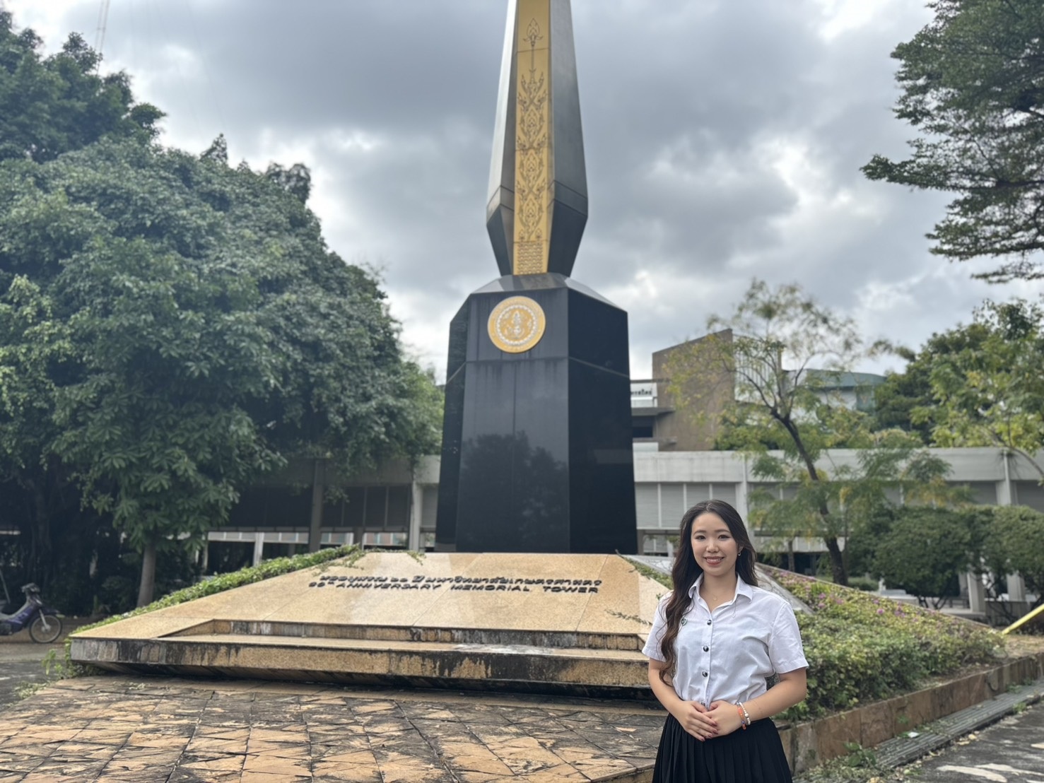 カセサート大学 記念塔の前に立つ制服姿の山口野の花さん