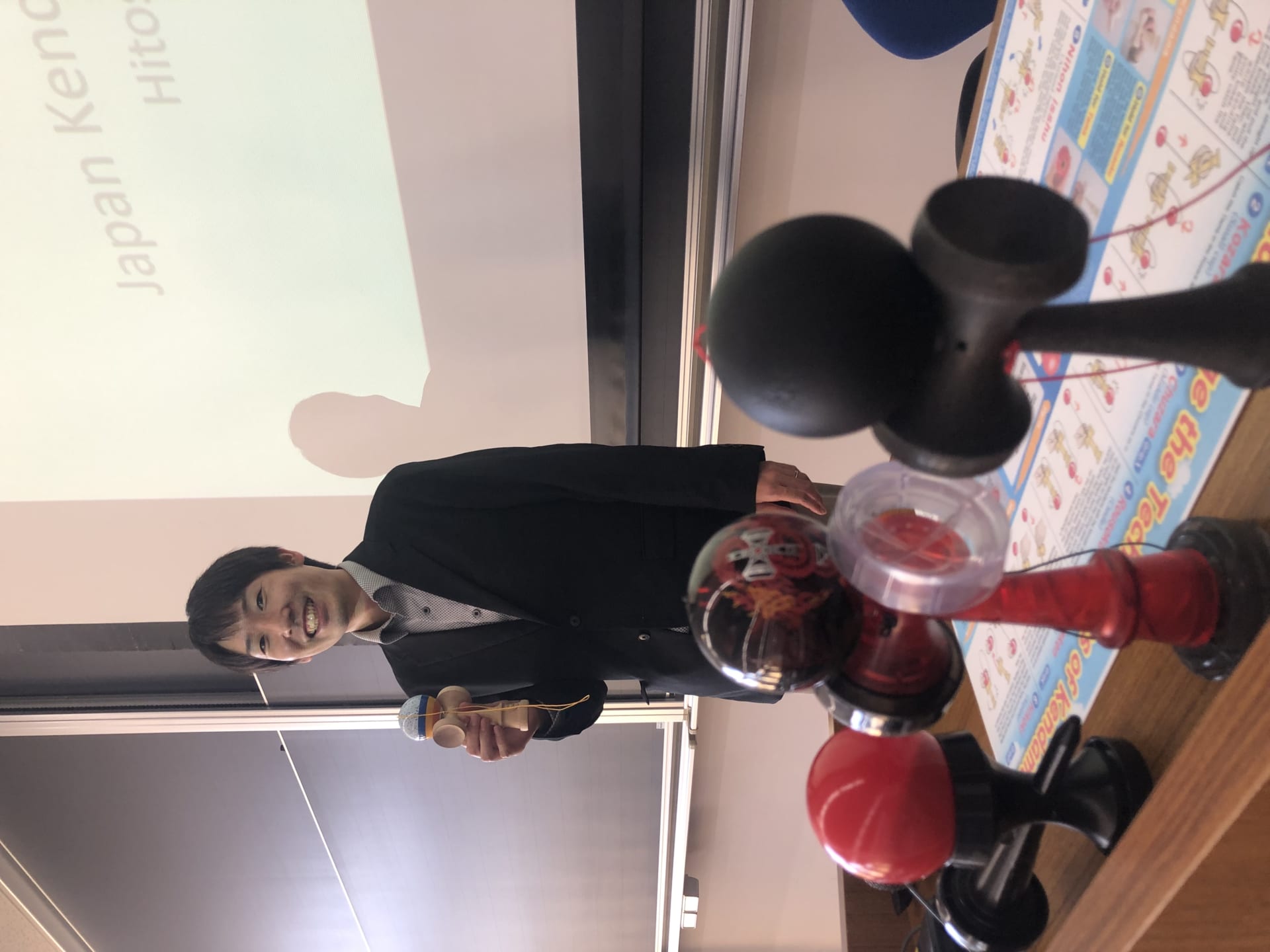 日本けん玉協会の川崎仁史先生をゲスト講師に迎え、まずけん玉の歴史やVR(バーチャル・リアリティー)を利用したけん玉の練習などけん玉について学びました。
