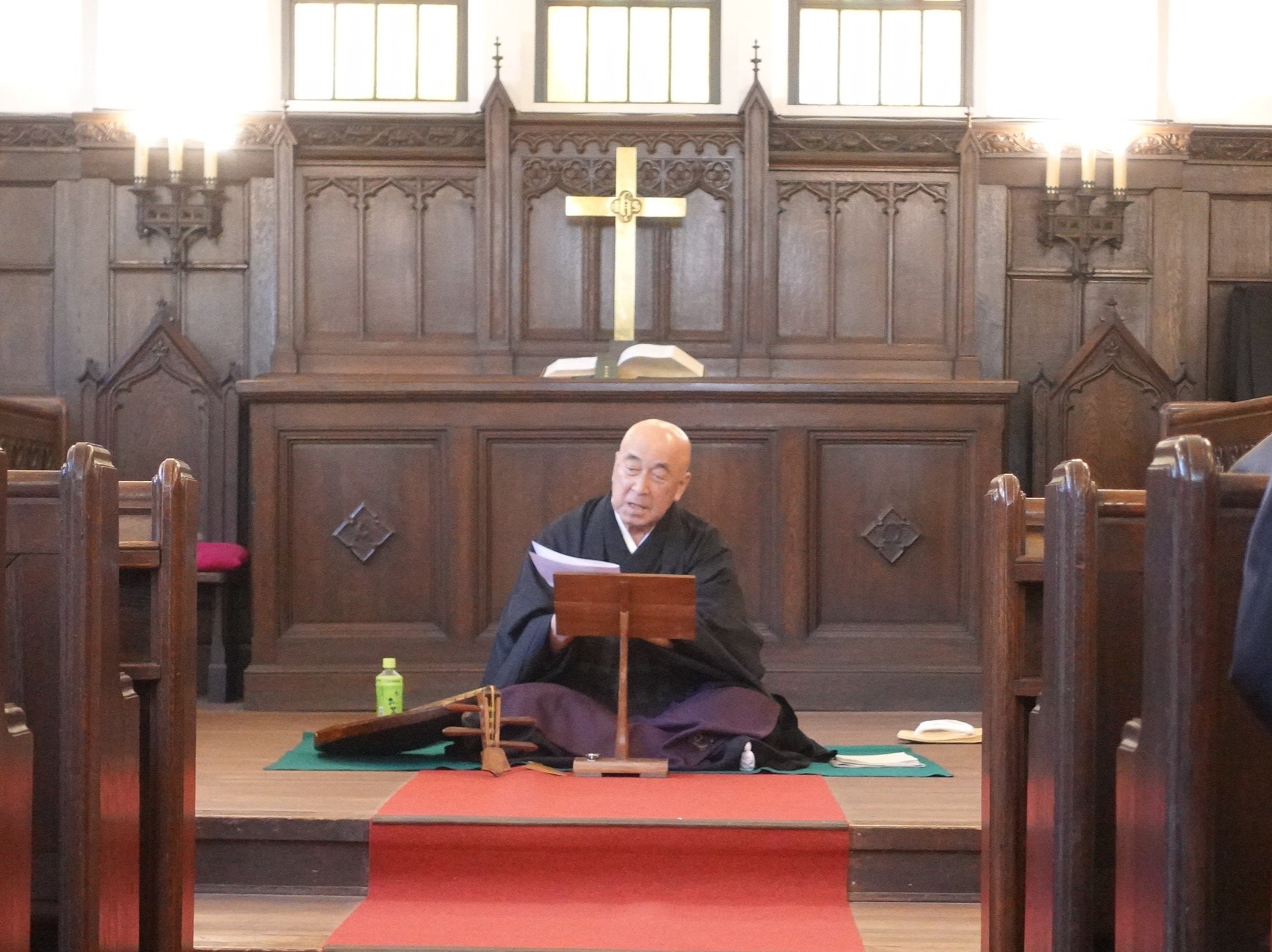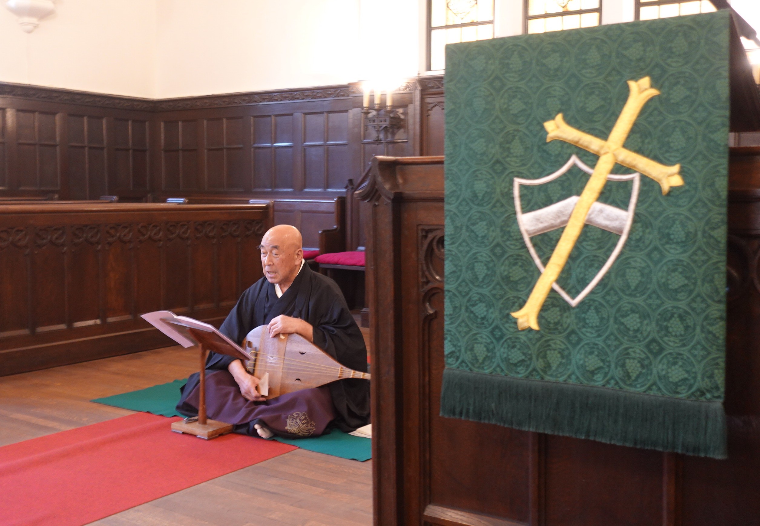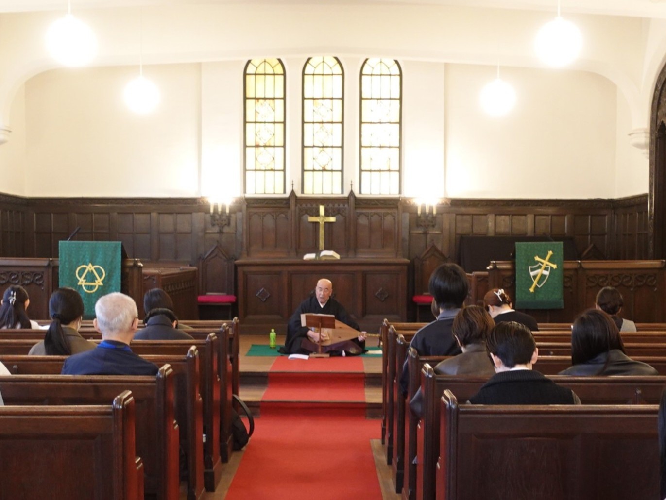 会場のチャールズ・オスカー・ミラー記念礼拝堂は学内で古い歴史を持つこともあり、長い時を経た木造の美しい壁に囲まれた礼拝堂に、鈴木先生の力強い声と琵琶の音が響くことになりました。会報60号(2026年3月発行予定)にも当日の様子は掲載されます。