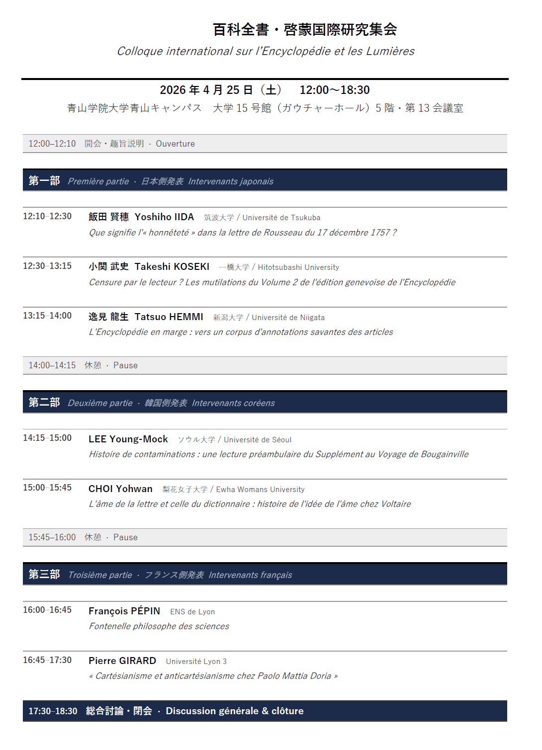 本集会は、『百科全書』および啓蒙思想に関する最新研究の成果を共有し、国際的な学術交流を促進することを目的としております。