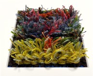 ワークショップFでは、ペルシャ絨毯のように毛足のあるノッティング織の技法を学び、紙枠を用いて約11cm×11cmの小作品を制作します。