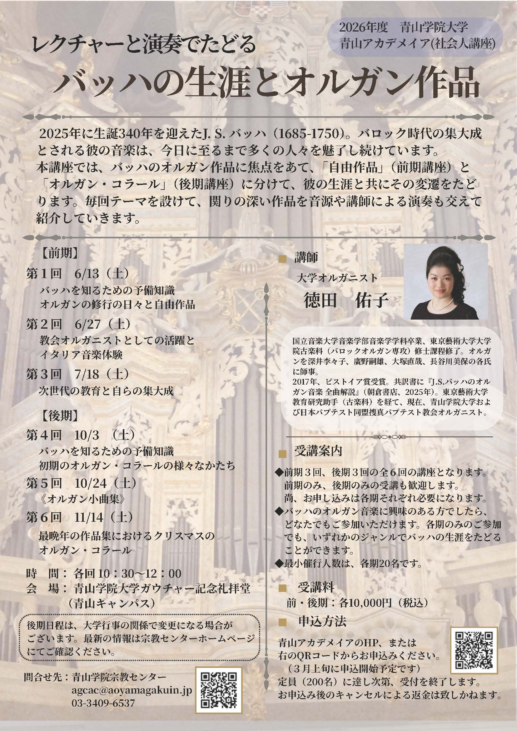 - ホーム イベント学外講座(イベント) 【青山キャンパスアカデメイア】レクチャーと演奏でたどる バッハの生涯とオルガン作品(前期)