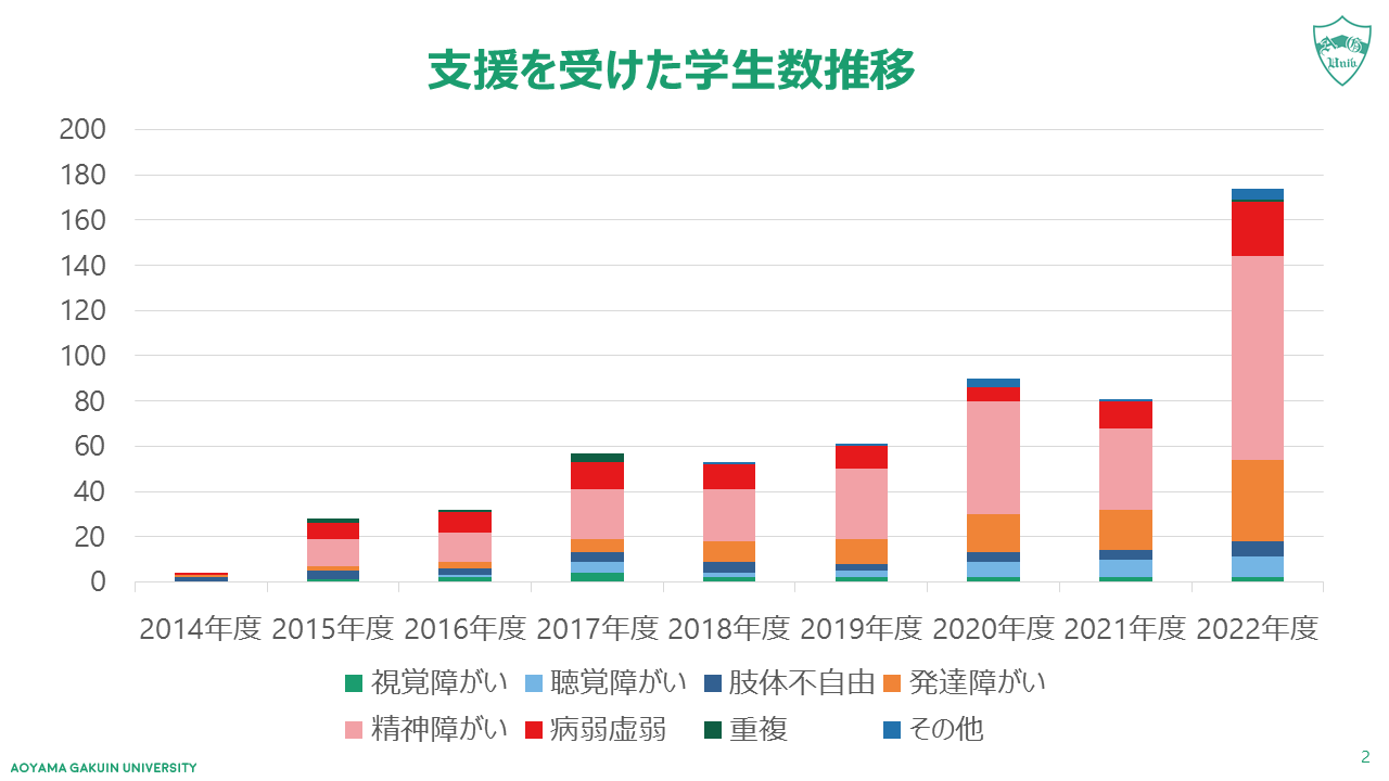 青山学院大学における2014年度~2024年度の在籍している障がい学生数の推移