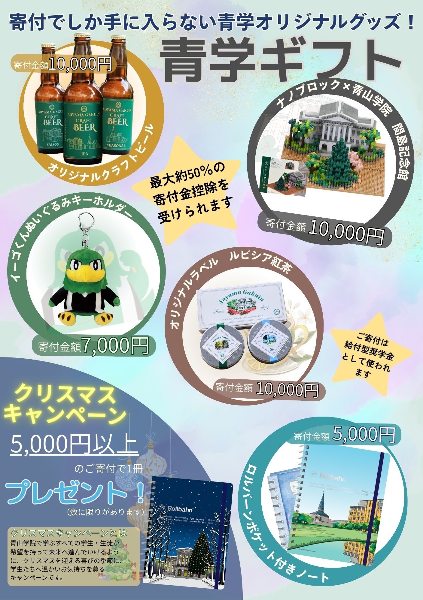 このキャンペーンはご寄付をいただいたみなさまと商品提供の校友(卒業生)の方をつなぐキャンペーンです。 ご寄付いただいたみなさまに感謝を込めて、校友(卒業生)の方々の想いがつまった”青学ギフト”をご用意しております。 いただいたご寄付は、給付型奨学金、教育研究資金、そして将来のための貯蓄(万代基本基金)として使用させていただきます。