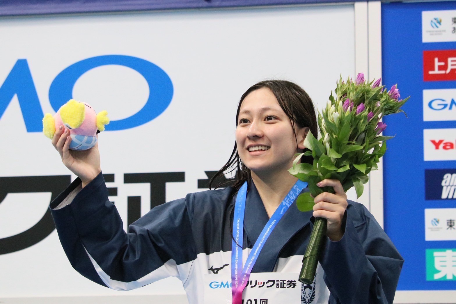 2025.10.6【水泳部】鈴木莉緒選手が「第101回日本学生選手権水泳競技大会」女子100m自由型で優勝、本学33年ぶりの金メダル