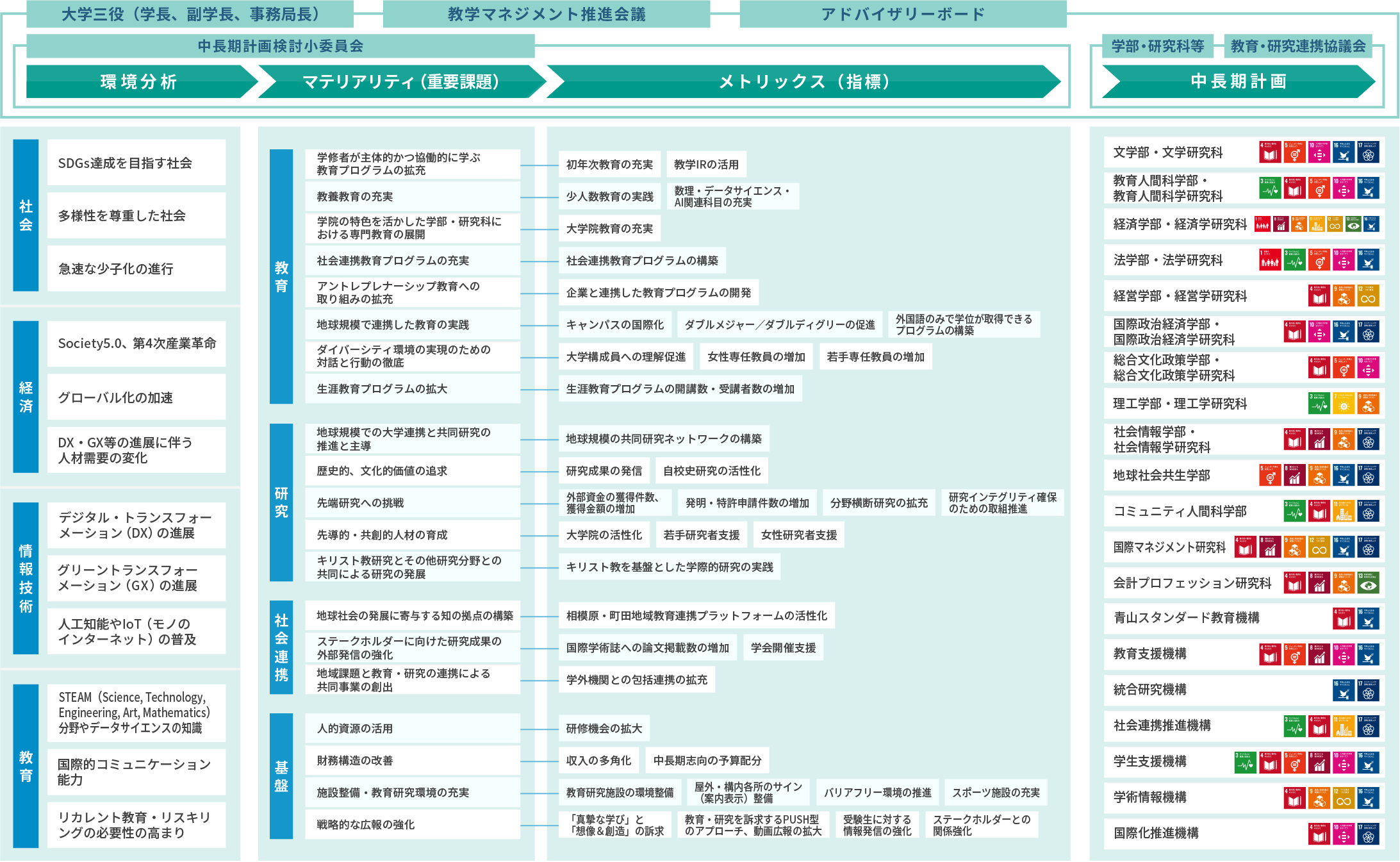マテリアリティ図によって、青山学院大学の中長期計画の全容を示しています。それは、当計画を策定したプロセス、マテリアリティ(重要課題)を特定するための環境分析、そして各マテリアリティ項目のメトリックス(指標)、そして各学部・研究科等の中長期計画とこの計画に対応するSDGsをもって作成しています。社会のニーズを取り入れた中長期計画とすべく産業界等との連携を図るための教育連携協議会を設置しています。