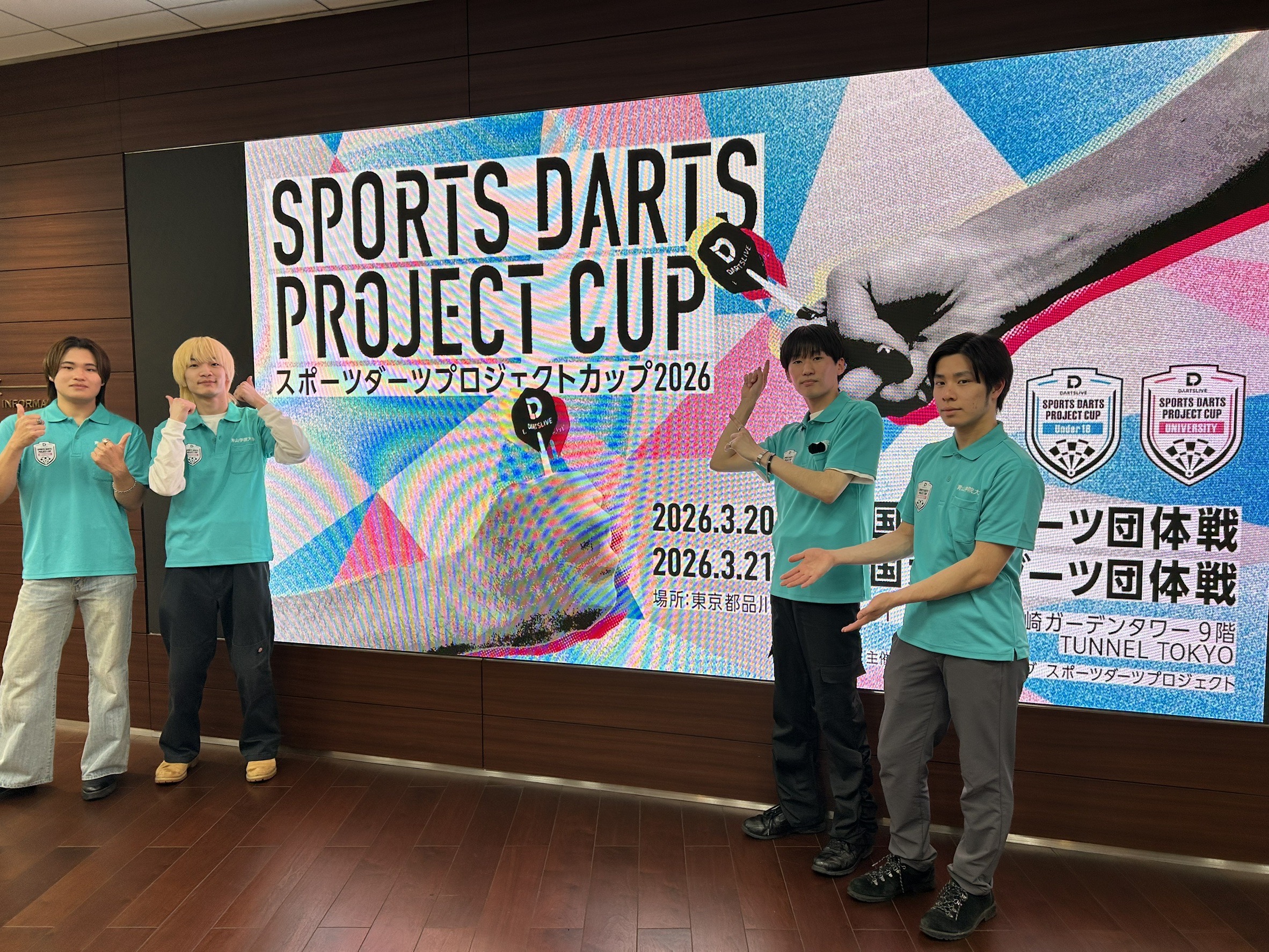 2026年3月21日(土)、本学代表として参加した、大石理人さん(経済学部 経済学科4年/リーダー)、荒川賢さん(経済学部 経済学科4年)、中村祐晟さん(経済学部 経済学科3年)、高𣘺咲翔さん(理工学部 数理サイエンス学科3年)が、株式会社ダーツライブ主催「スポーツダーツプロジェクトカップ2026 全国大学ダーツ団体戦」において、優勝、初代チャンピオンに輝きました。