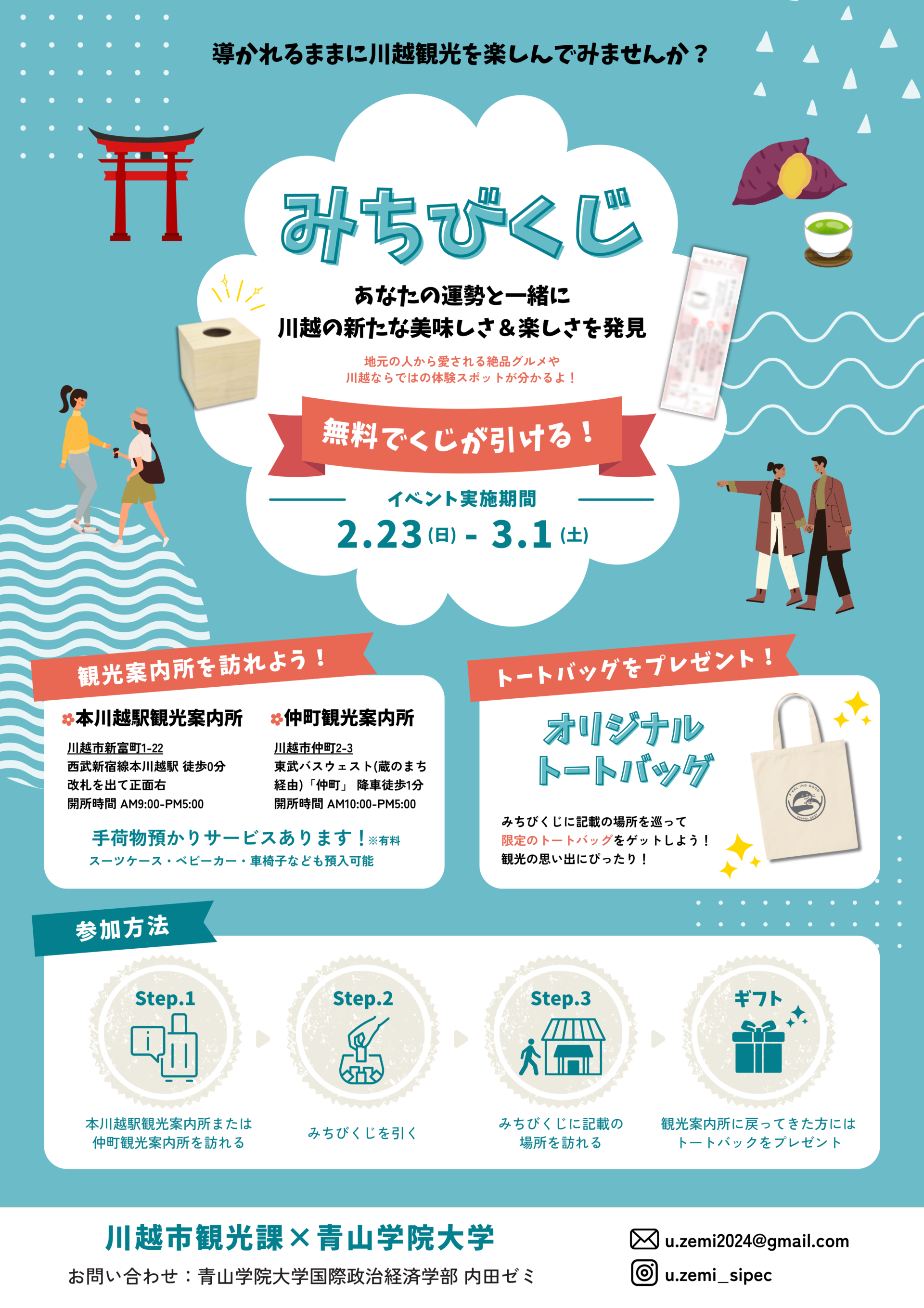 2025年2月23日(日)~3月1日(土)の期間中、国際政治経済学部 内田達也教授ゼミ(以下、内田ゼミ)が埼玉県川越市において、観光企画「みちびくじ」を実施します。内田ゼミの学生によるプロジェクトチームが考案した本企画では、本川越駅観光案内所または仲町観光案内所のいずれかを訪問された方を対象に、地元の人に愛されている穴場スポットが書かれた「みちびくじ」を通して、川越市のまだ知られていない、未知の観光地へと導きます。