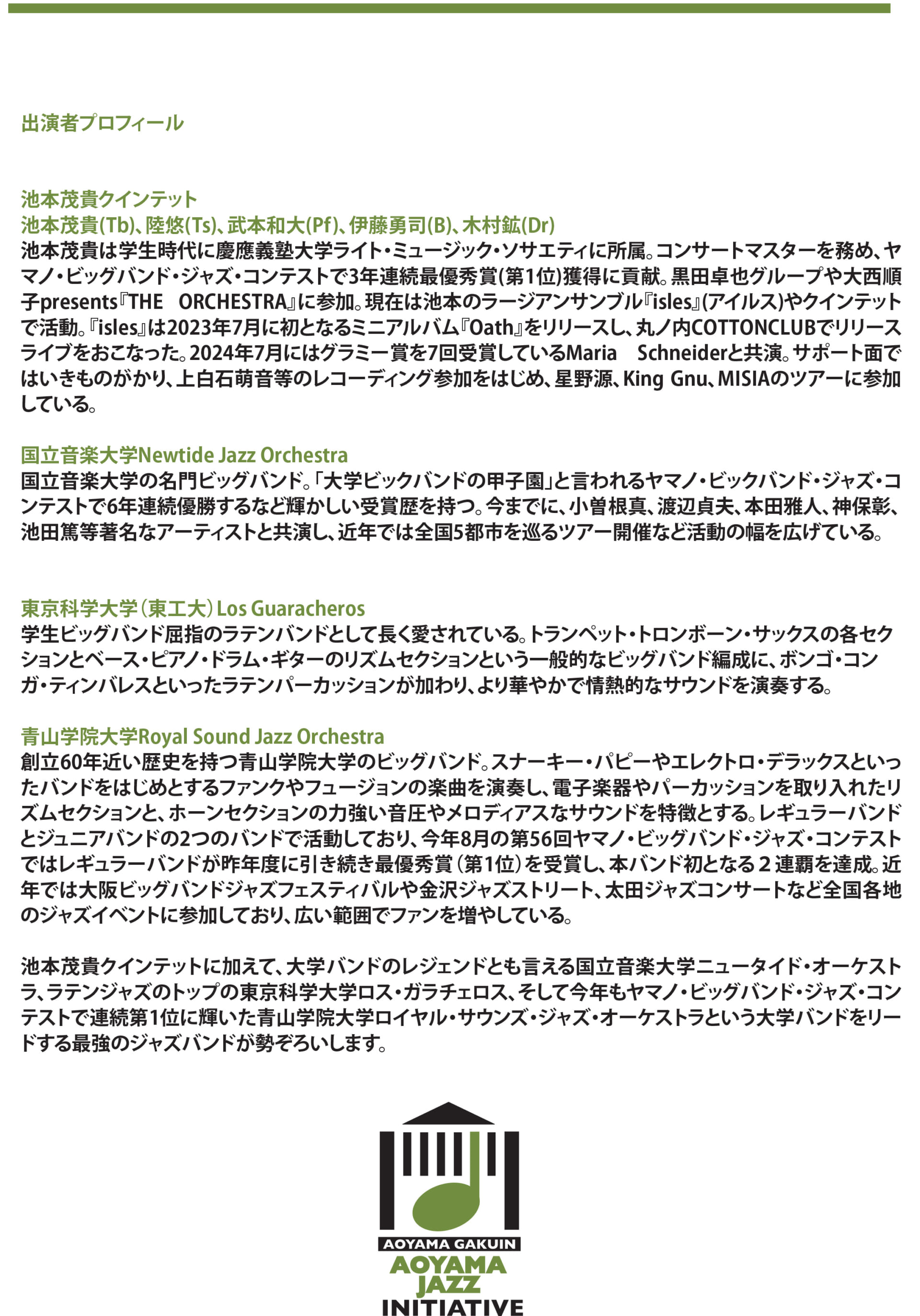 大学ジャズバンドのレジェンドとも言える国立音楽大学New Tide Jazz Orchestra、ラテンジャズのトップの東京科学大学ロス・ガラチェロス、そして昨年に引き続き今年も「ヤマノ・ビッグバンド・ジャズ・コンテスト」で第1位に輝いた青山学院大学ロイヤル・サウンズ・ジャズ・オーケストラが参加し、大学ジャズをリードする最強のビッグバンドが勢ぞろいします。また、バンドIsles(アイルス)をはじめとする、さまざまなシーンで活躍するトロンボーン奏者の池本茂貴氏率いるクインテットも出演します。