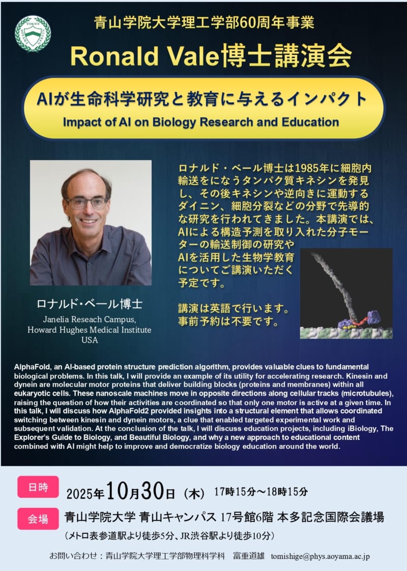 2025年10月30日(木)、青山キャンパスにて、Ronald Vale(ロナルド・ベール)博士をお迎えし、「AIが生命科学研究と教育に与えるインパクト(Impact of AI on Biology Research and Education)」と題した理工学部60周年記念事業の講演会を開催します。