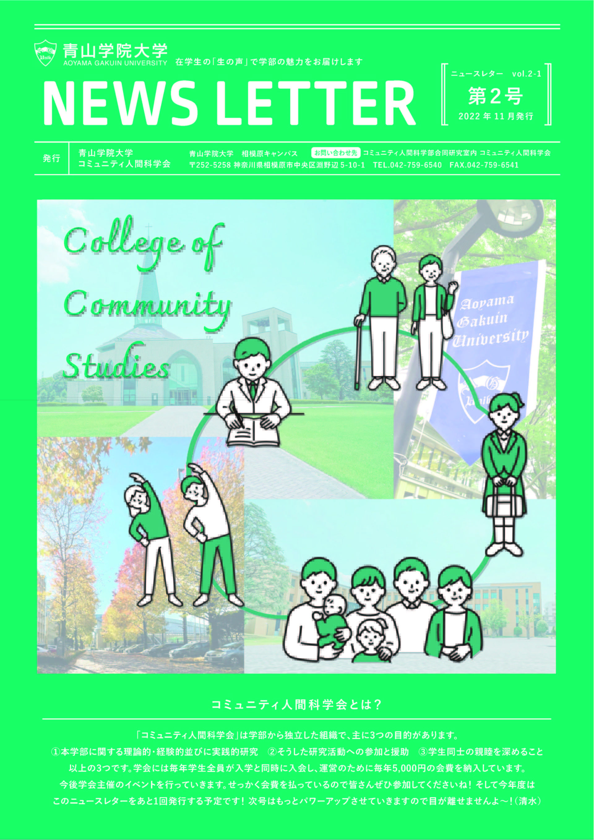 コミュニティ人間科学会(以下、本学会)は、コミュニティ人間科学部が扱おうとしている地域のさまざまな課題に関する研究と教育の発展に寄与するために、学部に所属する教員と学生を会員とした団体です。