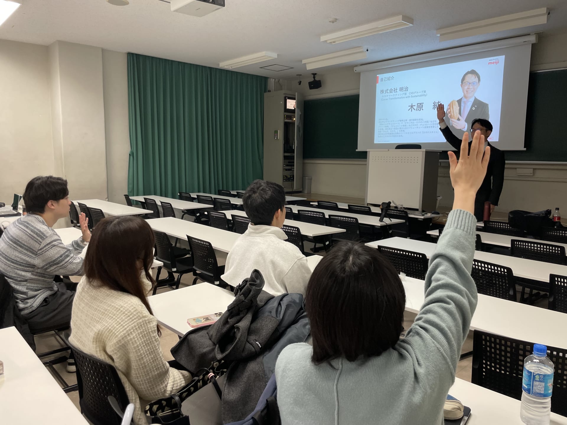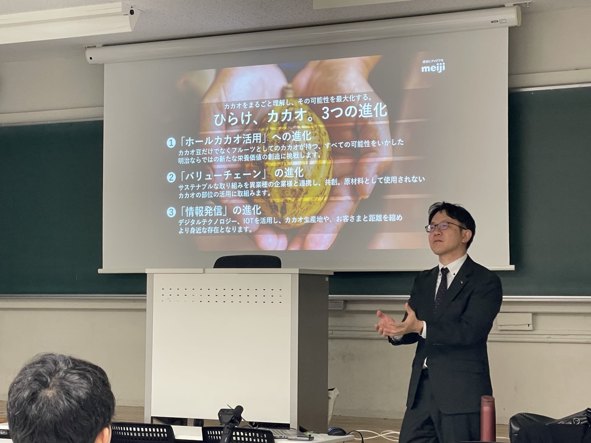 株式会社 明治の木原 純 氏(グローバルカカオ事業本部 カカオマーケティング部CXS グループ長)をお招きし、チョコレートの原料であるカカオから持続可能な社会を大学生とともに考える企画「サステナブルカカオ会議(SCAJ)」(※1)を本学で開催しました。