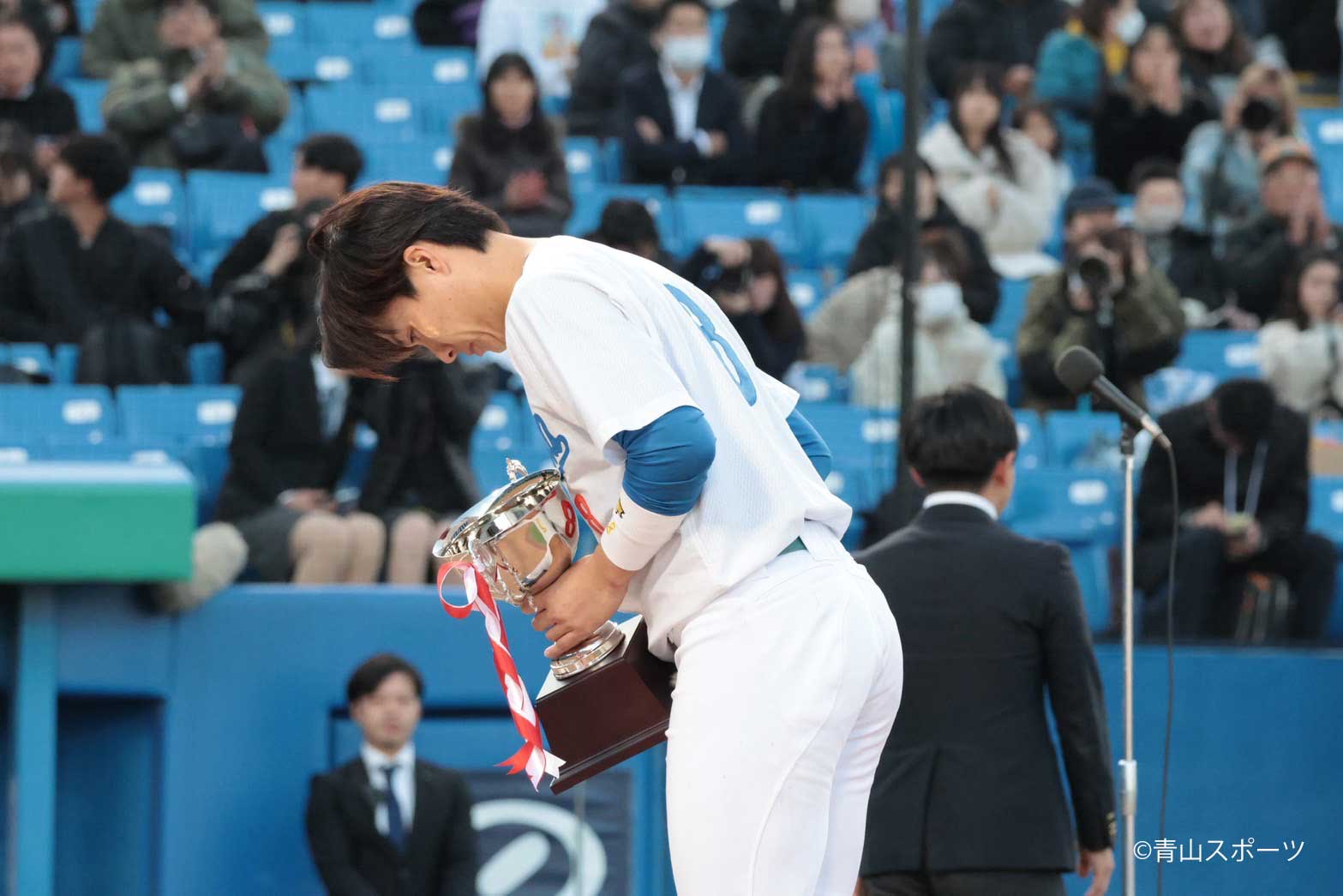 春の全日本大学野球選手権大会は優勝できず、つらい時期もありましたが、最後に良い結果で終わることができ、本当に良かったです。選手全員がそれぞれ成長し、チームを引っ張ってくれて、主将として助けられた場面も多くありました。中西聖輝選手は何試合も投げてくれて、本当に感謝しています。そして、応援してくださった皆さん、心から感謝します。
