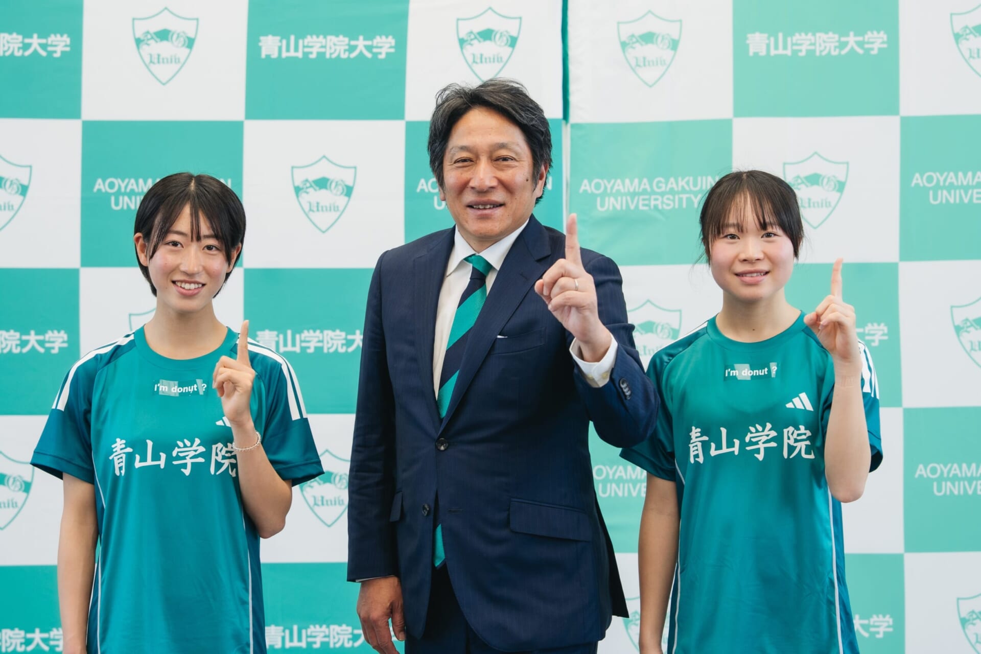 (左から)芦田和佳(のどか)選手、原晋監督、池野絵莉(かいり)選手