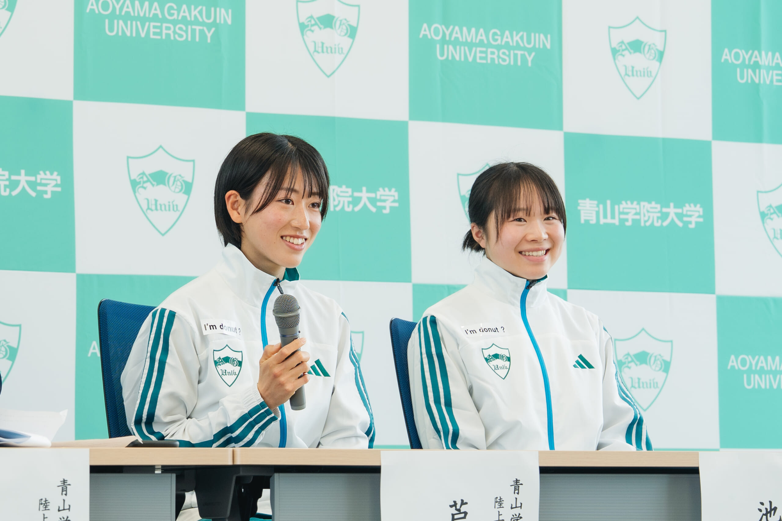 (左から)芦田和佳選手、池野絵莉選手 チームの1期生となる芦田和佳選手(コミュニティ人間科学部1年)は「これから私たちの走りで、多くの方に元気を届けられるように、陸上競技を楽しみながら頑張っていきたい」と語り、池野絵莉選手(コミュニティ人間科学部1年)は「この4年間で個人の力を磨き、自分たちの走りで応援や支援していただいている方に感謝の気持ちを表現したい」と今後への意気込みを語りました。